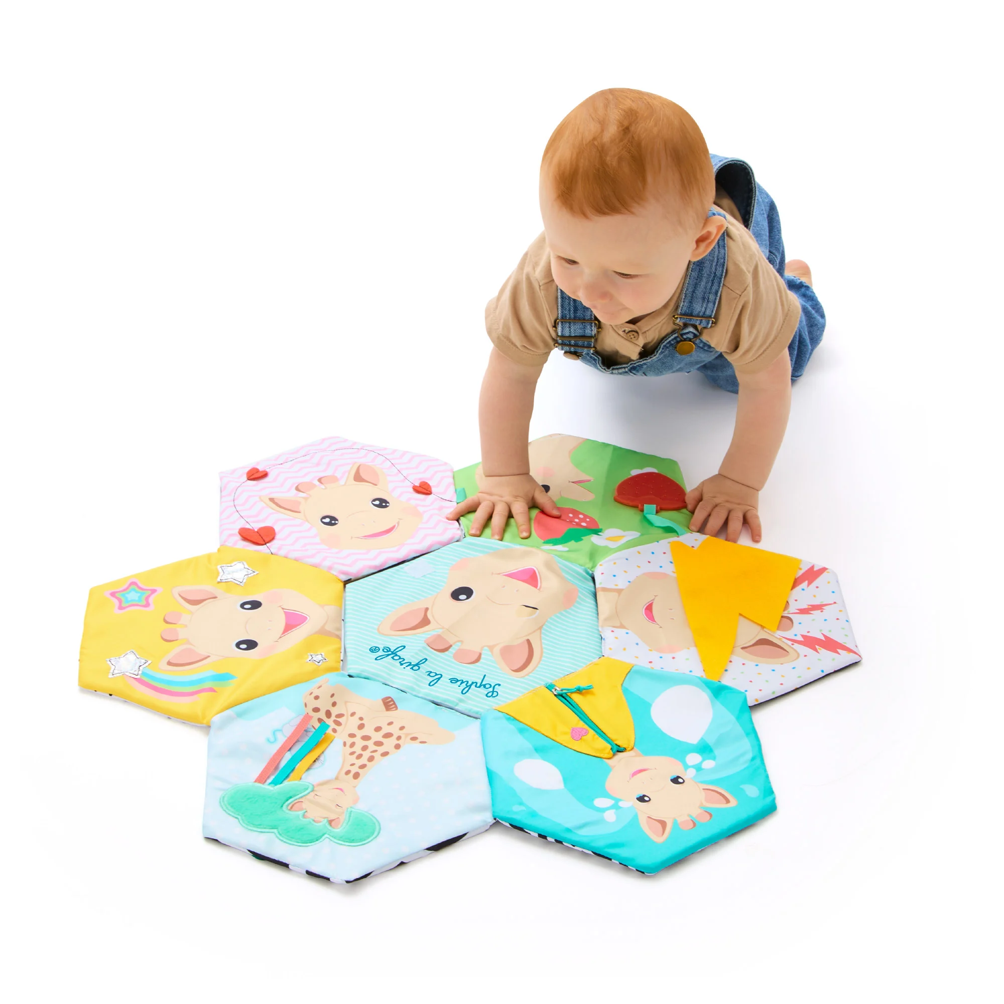 Libro tapete de actividades Sophie la girafe: juguete sensorial de tela que se despliega en un tapete de exploración para estimular los sentidos del bebé.