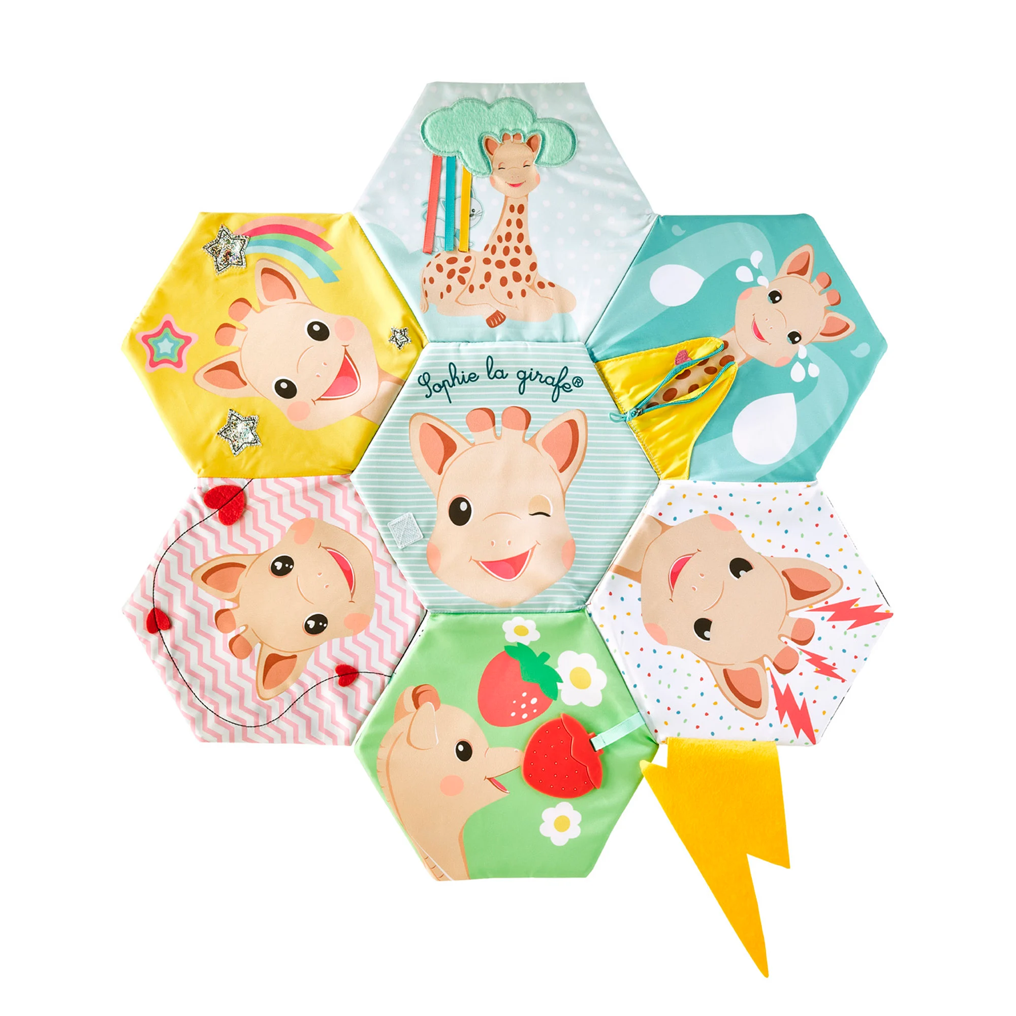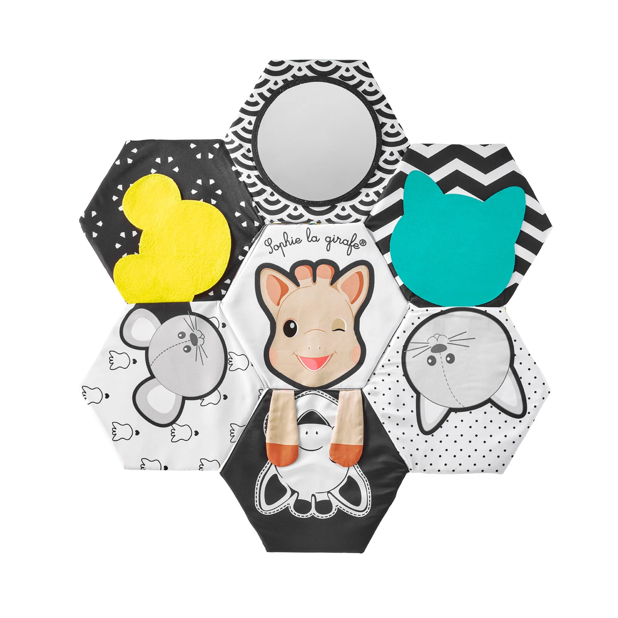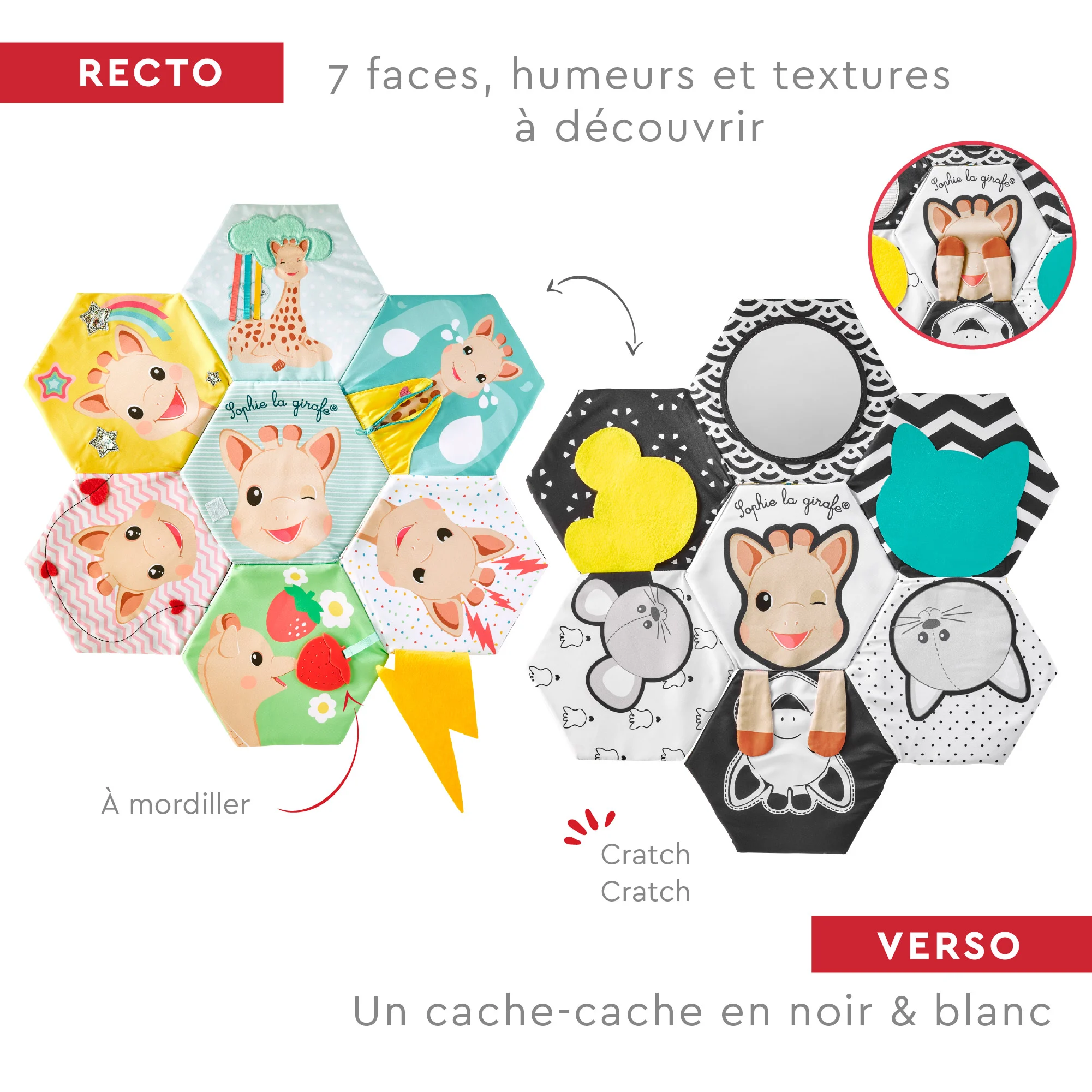 En una de sus caras el bebé puede descubrir diferentes expresiones de Sophie la girafe, ayudando a reconocer emociones. En la otra cara presenta un universo visual con contrastes en blanco y negro que estimulan la vista durante los primeros meses.