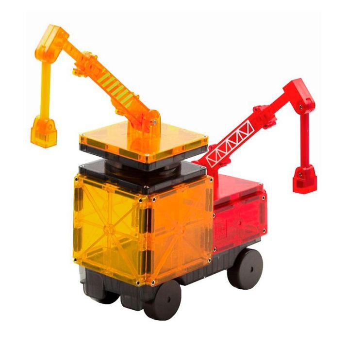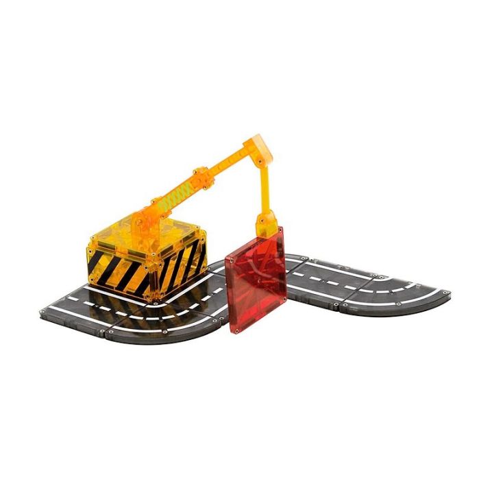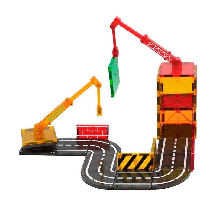Incluye grúas articuladas funcionales que suben, bajan y giran 360 grados, además de piezas con detalles impresos como carreteras o ladrillos que enriquecen la experiencia narrativa. Sus potentes imanes y refuerzos interiores garantizan uniones firmes y estabilidad en las construcciones.