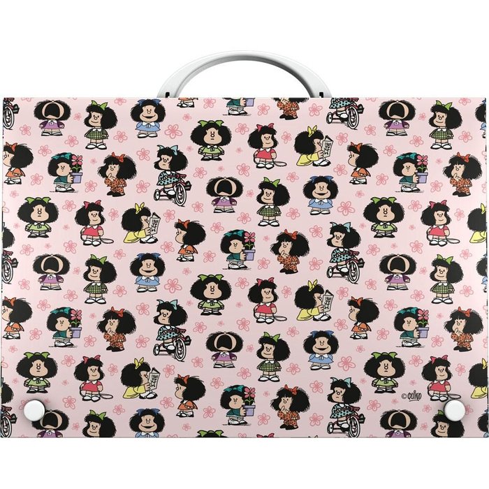 Este maletín escolar está fabricado en polipropileno.Tiene tamaño folio, unos prácticos cierres de broche en su parte frontal y una cómoda asa para llevarlo a cualquier parte. Este maletín pertenece a la colección de papelería Mafalda Viñetas y presenta un diseño colorido y actual basado en las viñetas de mafalda. Puedes encontrar más complementos para completar tu material de papelería a juego con este portadocumentos con asa dentro de la Colección Mafalda Viñetas: mochilas escolares, estuches, clasificadores, carpetas de cartón, cuadernos y carpesanos.