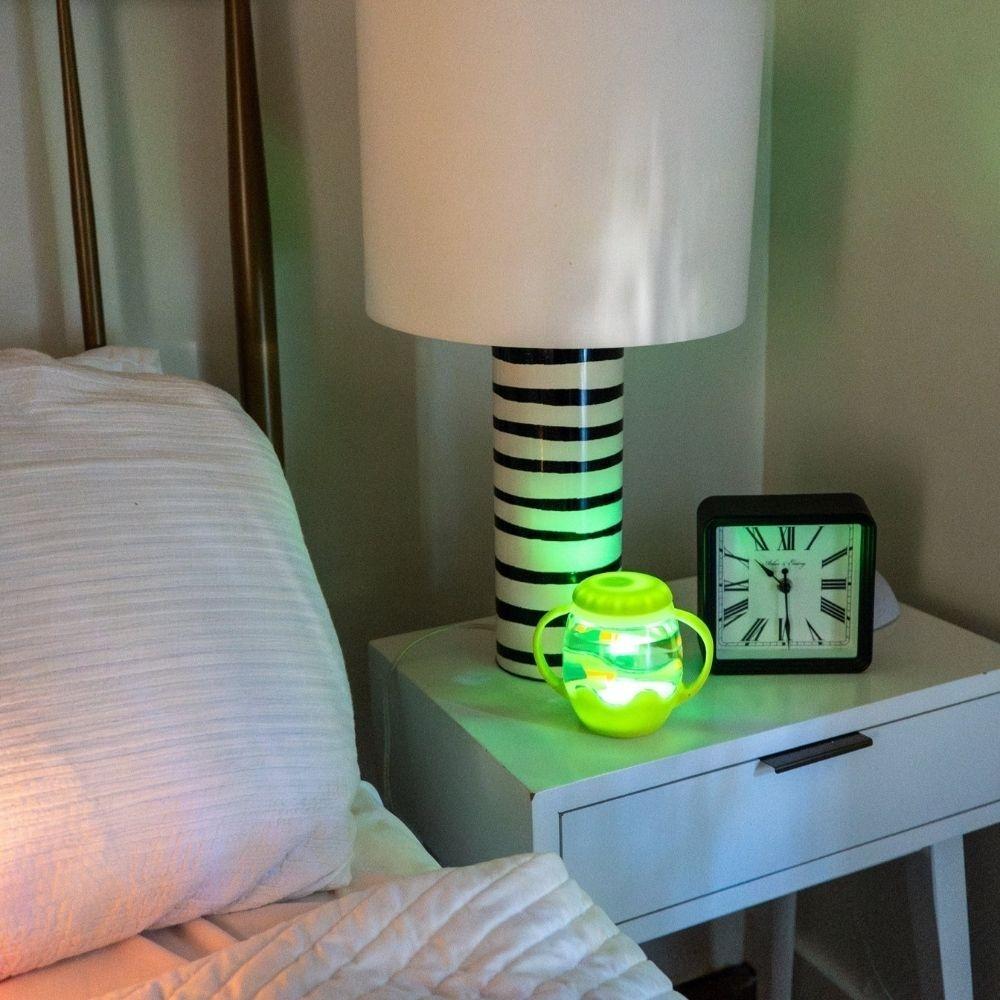 Mini jarra sensorial verde: luz sensorial portátil que cambia entre 9 colores al añadir agua y tocarla, diseñada para momentos de calma, exploración y juego.
