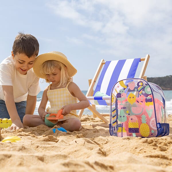 Esta mochila es ideal tanto para ir a la playa como a la piscina gracias a su acabado impermeable. Es perfecta para transportar los juguetes y otros juguetes personales de los más pequeños. Y pueden llevarla ellos mismos, tanto colgada en la espalda o sujetándola con la mano. Es muy espaciosa para que tengan todo lo que necesitan y puedan pasar un divertidísimo día jugando al aire libre. Gracias a su diseño transparente verán en seguida si lo tienen todo y podrán asegurarse de no perder nada. Y, como la parte inferior está fabricada con estructura de red, la arena se filtra para que no acabe en el suelo cuando llegues a casa