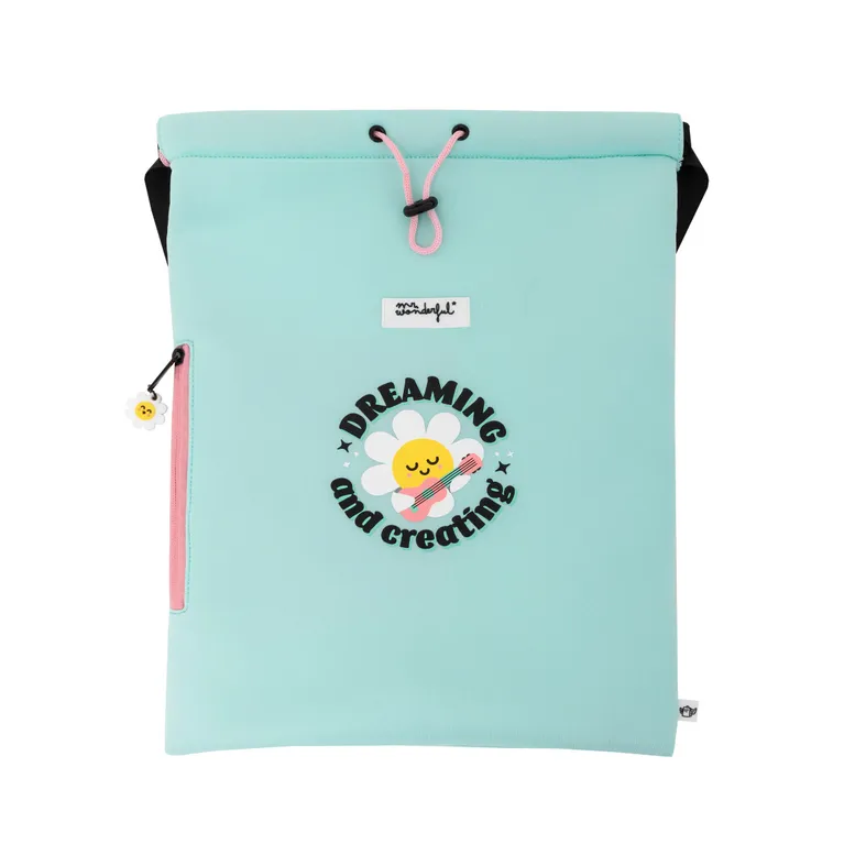 Mochila tipo saco, realizada en neopreno. Con asas de longitud ajustable y un bolsillo exterior en uno de sus laterales, cuyo tirador tiene forma de unicornio Mr. Wonderful, lo que le aporta originalidad.