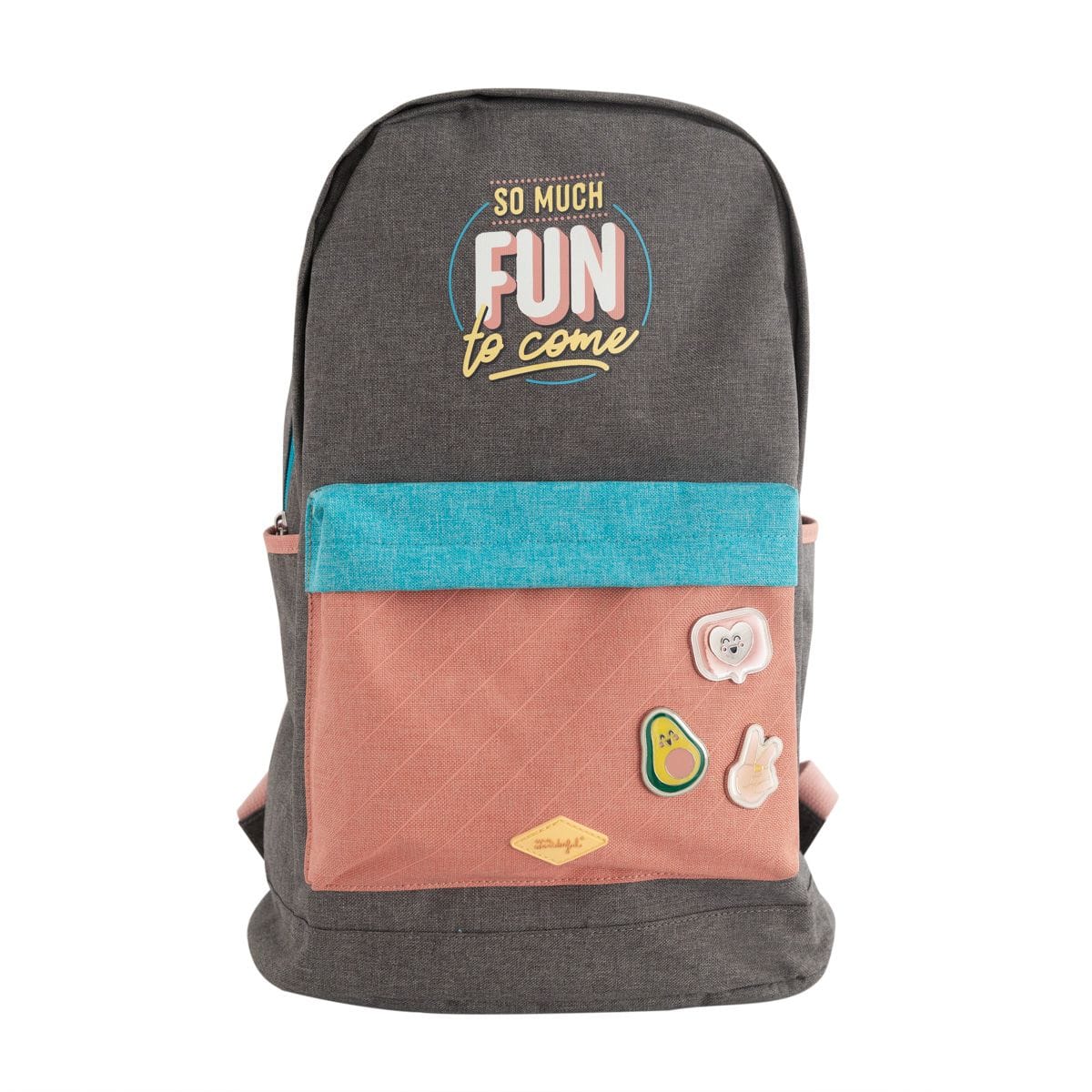 Mochila escolar con diseño Mr. Wonderful fabricada en rPET (material 100 % reciclable, obtenido a partir del reciclaje de botellas de plástico). Incluye compartimento interior para portátil, pines decorativos y llavero colgante con forma de estrella Wonder. Tamaño: 32 x 46 x 14,5 cm.
