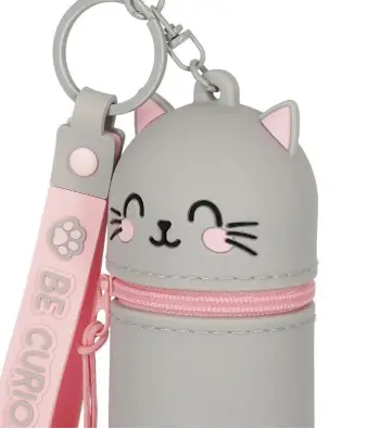 Incluye una anilla metálica tipo llavero que permite engancharlo fácilmente a mochilas, bolsos o estuches. Además, incorpora una correa decorativa con el mensaje “YOU’RE PURR-FECT”, que añade un toque divertido y simpático al diseño.