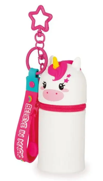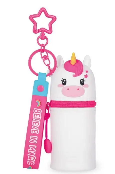 Incluye una anilla metálica tipo llavero que permite engancharlo fácilmente a mochilas, bolsos o estuches. Además, incorpora una correa decorativa con el mensaje “BELIEVE IN MAGIC”, que aporta un toque alegre e inspirador.