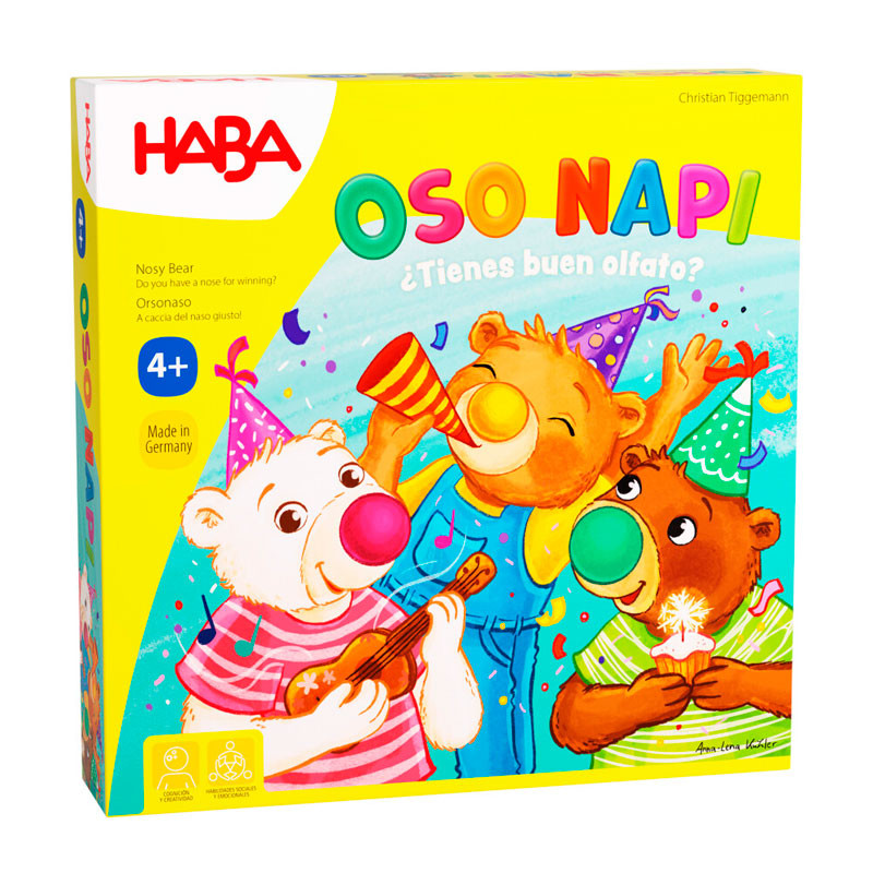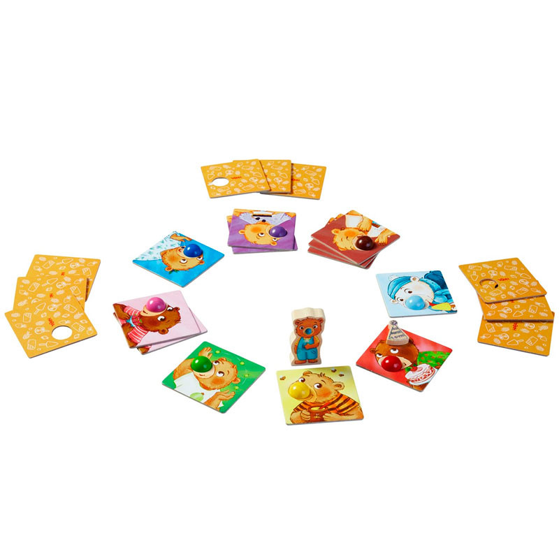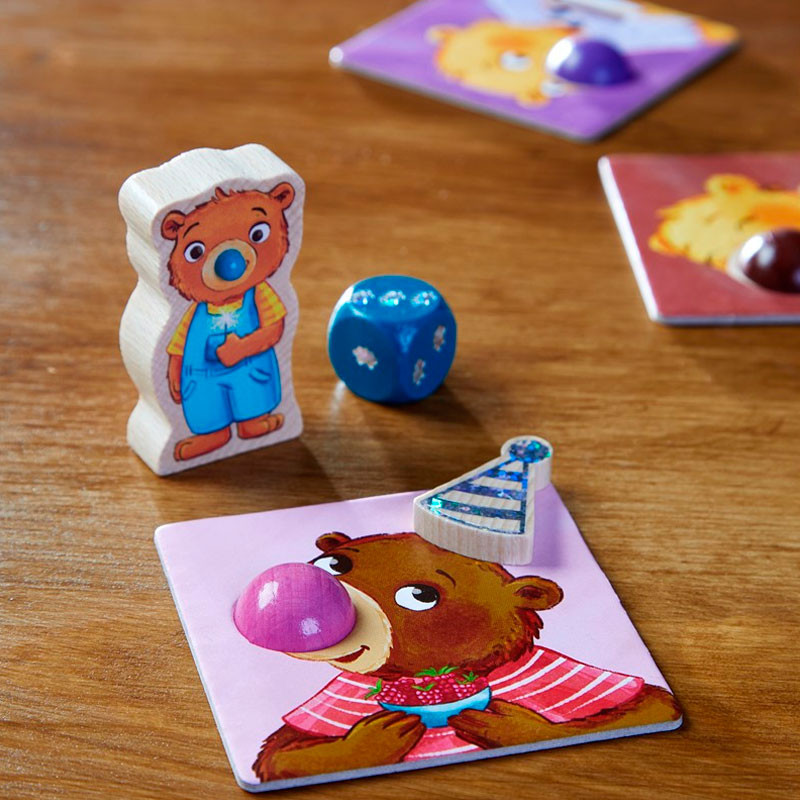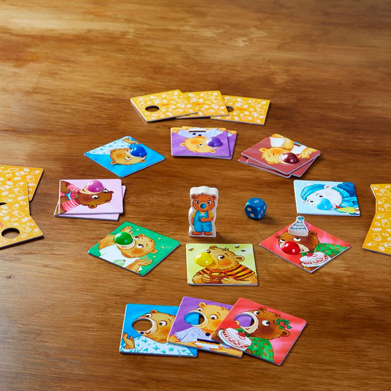 Un juego de dados en el que, por turnos, deberemos lograr deshacernos de las 6 cartas de osos que tengamos en la mano, colocándolas sobre la nariz del color correspondiente.