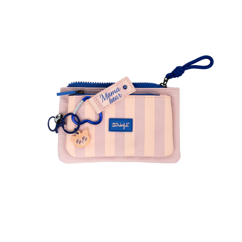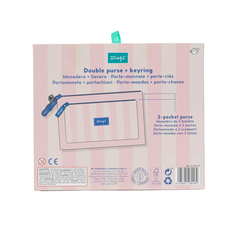 El pack regalo She Bear de Mr Wonderful incluye un monedero y un llavero a juego, diseñados con un estilo dulce y actual perfecto para regalar. El monedero presenta un diseño de rayas en tonos suaves con cierre de cremallera, mientras que el llavero incorpora detalles decorativos con un simpático osito.