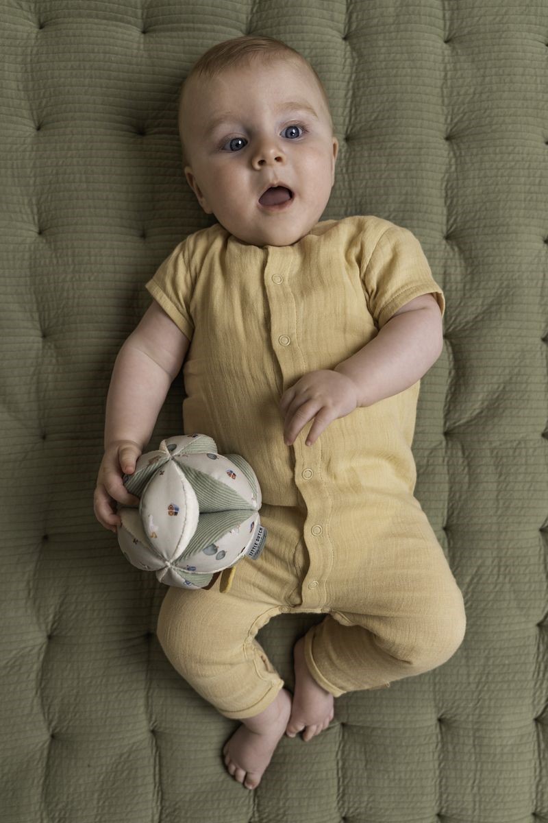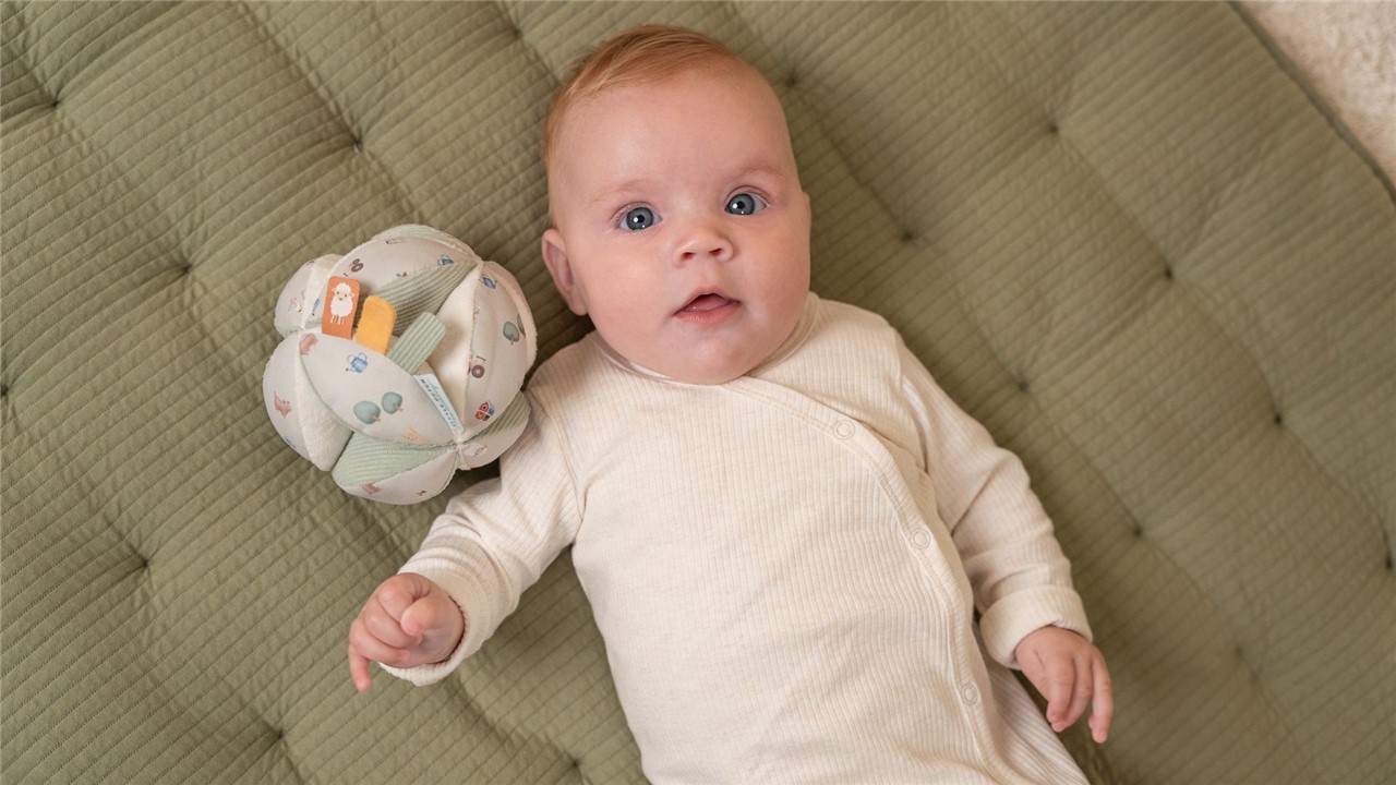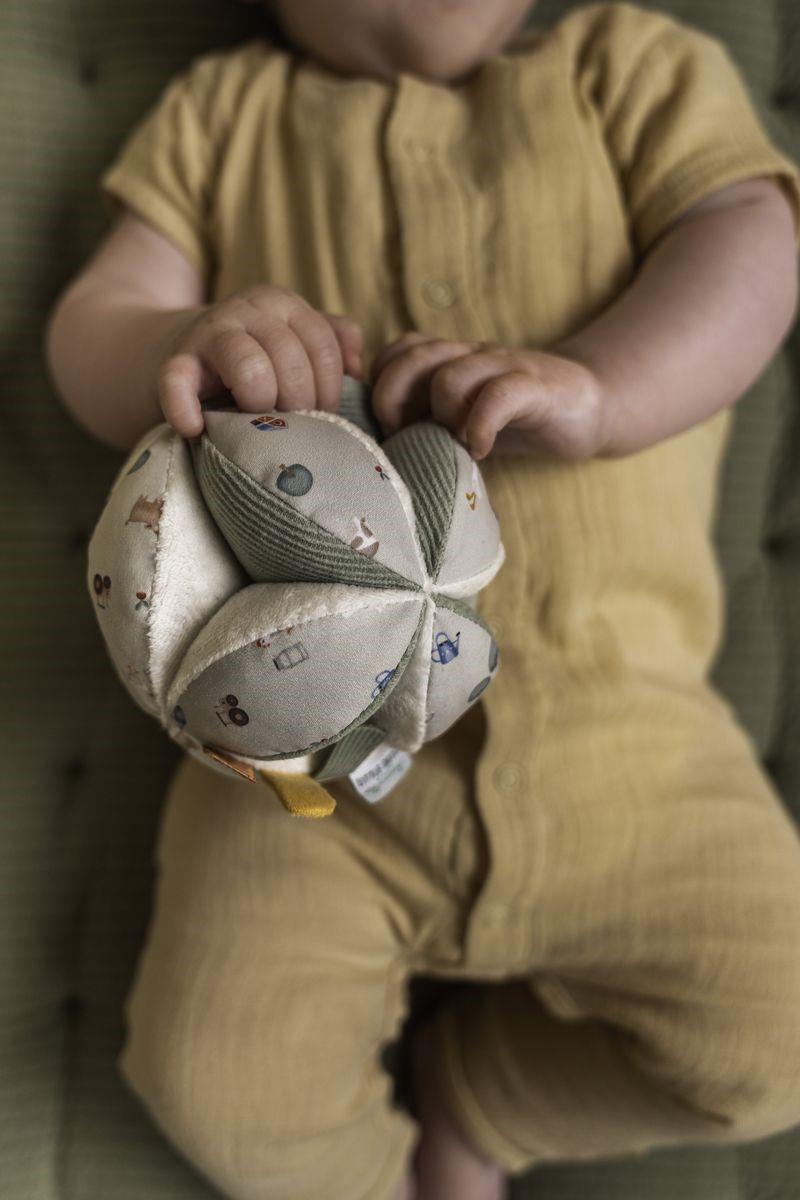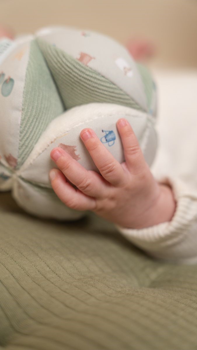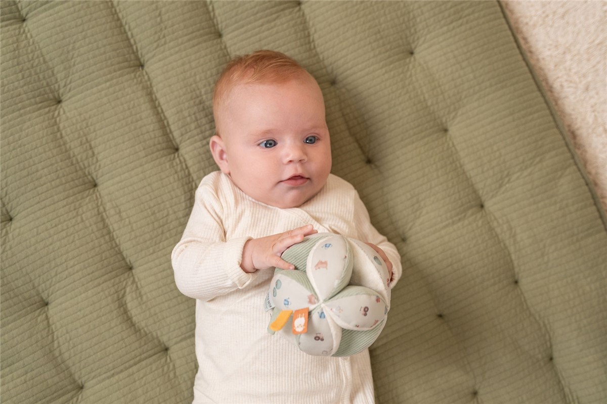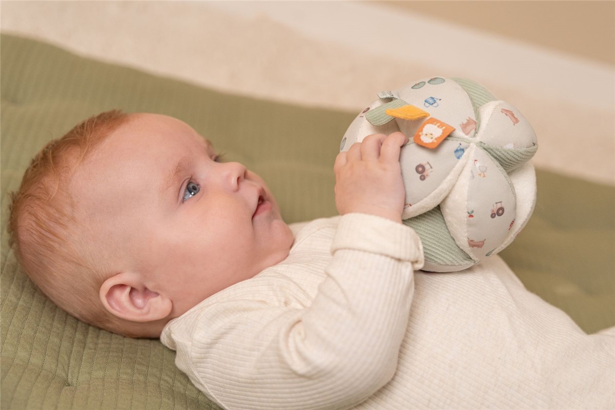¡Tírala y ve por ella! Esta pelota montessori con su forma interesante es un gran desafío para su pequeño. Hay muchos lugares para agarrar y explorar con diferentes texturas y patrones. Es fácil de levantar para las manos pequeñas y cuando se mueve, el alegre sonido de la campana animará a su bebé. Diseñada para la nueva colección Little Farm, los nudos fáciles de agarrar y las diversas etiquetas estimularán los sentidos, desarrollarán el agarre y mantendrán a su bebé ocupado en el parque.