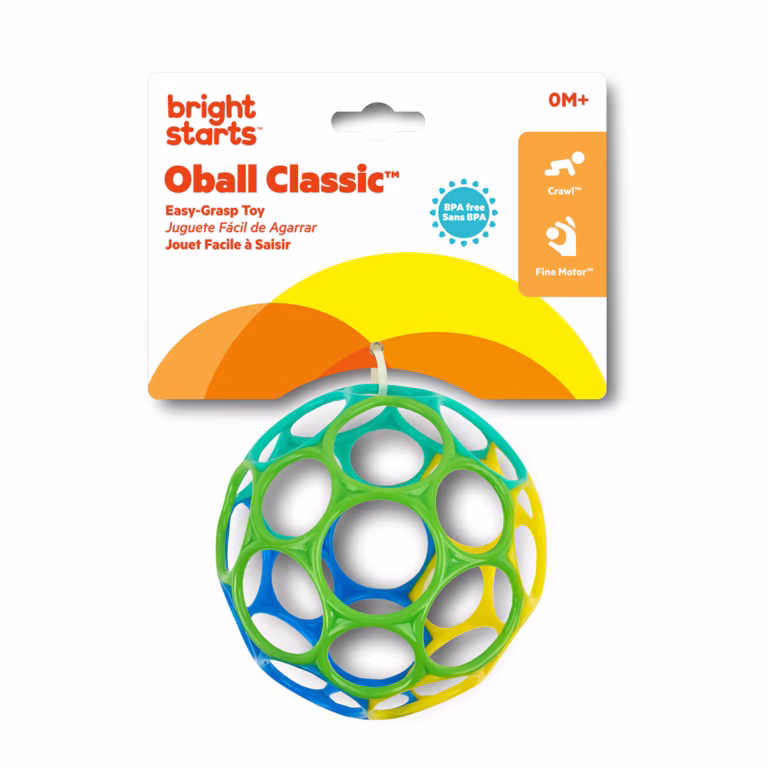 La Pelota Oball Classic Easy Grasp de Bright Starts es un juguete imprescindible para bebés en sus primeros meses de vida. Su diseño con grandes aberturas hace que incluso las manos más pequeñas puedan agarrarla con facilidad. Fabricada en material flexible, suave y seguro, estimula la coordinación ojo-mano y favorece el desarrollo sensorial mientras el bebé juega, explora y descubre nuevas formas de interacción.