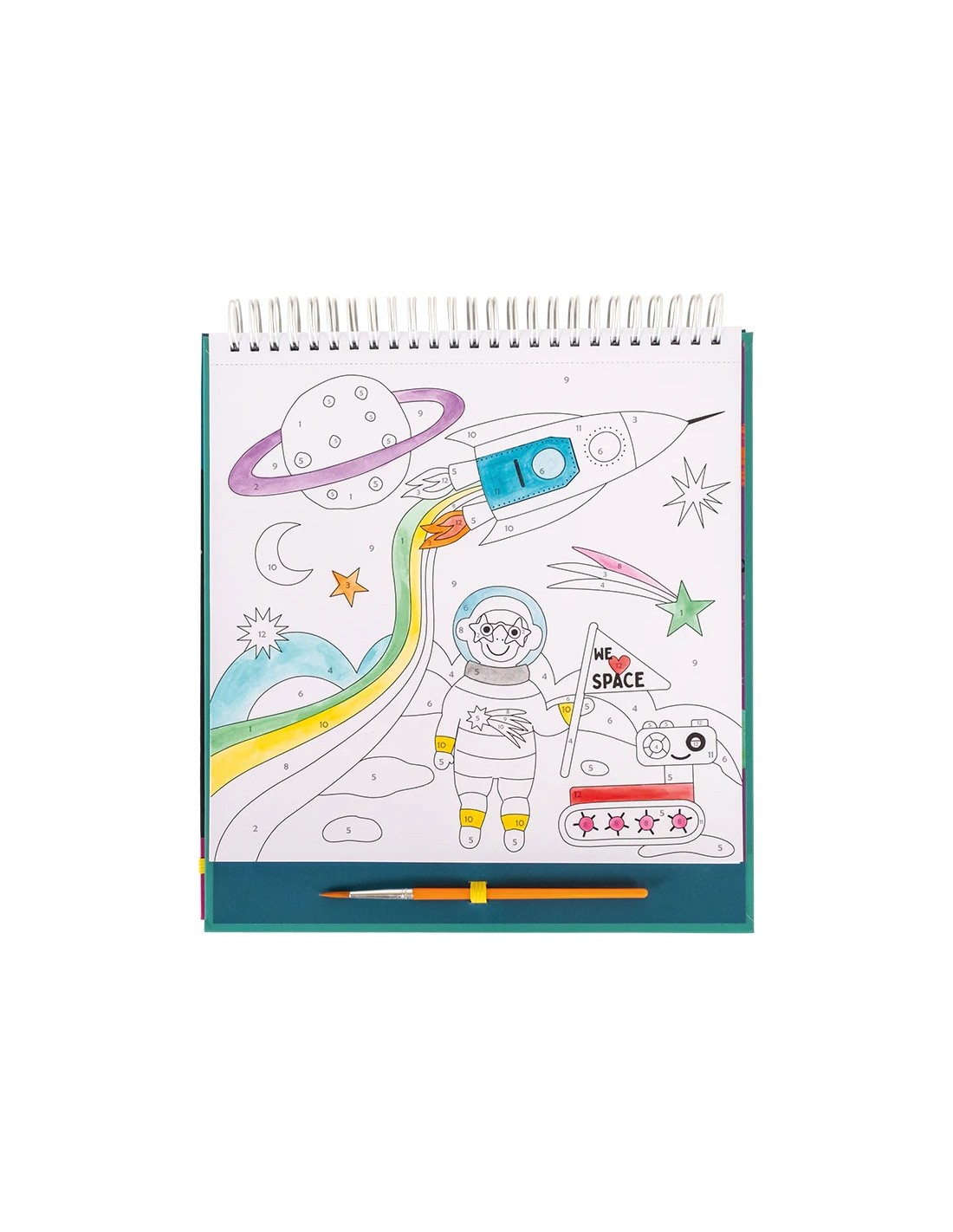 Disfruta de horas de diversión creando obras maestras con temática del espacio. Los dibujos se dividen en zonas numeradas que se corresponden con diferentes colores. Tu solo coge el pincel y la paleta de pintura con forma de cohete correspondiente y ¡a pintar!