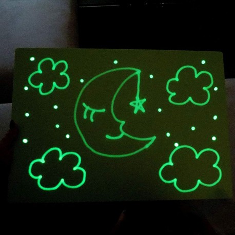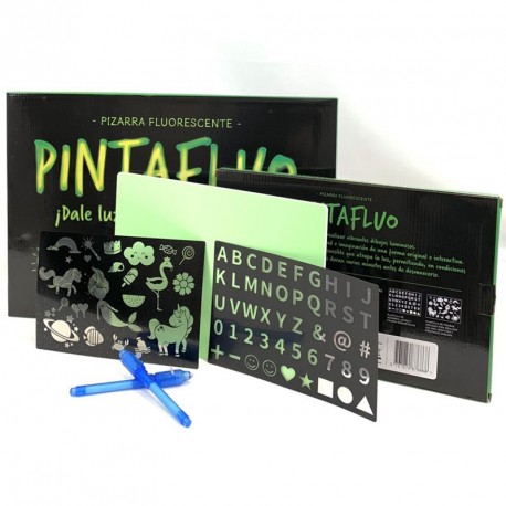 PintaFluo es un tablero fotosensible que atrapa la luz permitiendo generar dibujos en la oscuridad que duran varios minutos en la pizarra antes de desvanecerse.