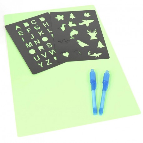 La tinta invisible permite escribir mensajes «secretos» sobre cualquier superficie y sólo podrá ser vista iluminándola con la luz del lápiz. No escribas sobre la pizarra.