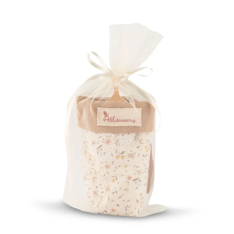 El Portabiberón con Biberón de la Colección Teresa es el complemento perfecto para que los niños alimenten a sus muñecos de forma realista. Su diseño combina estética y funcionalidad gracias a su cinta de grosgrain beige con detalle rosa y su presentación en una bolsa de tul con lazo, que permite guardarlo y transportarlo fácilmente.