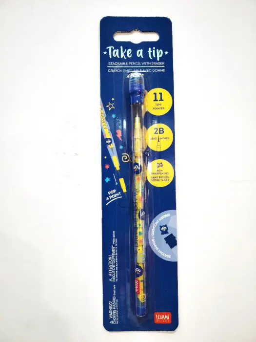 Gracias a su sistema de minas apilables, no es necesario afilarlo: simplemente extrae la mina usada y reemplázala por la siguiente. Su goma superior es muy práctica para borrar errores al instante, y su diseño compacto y divertido lo hace ideal para regalar o llevar en el estuche a diario.