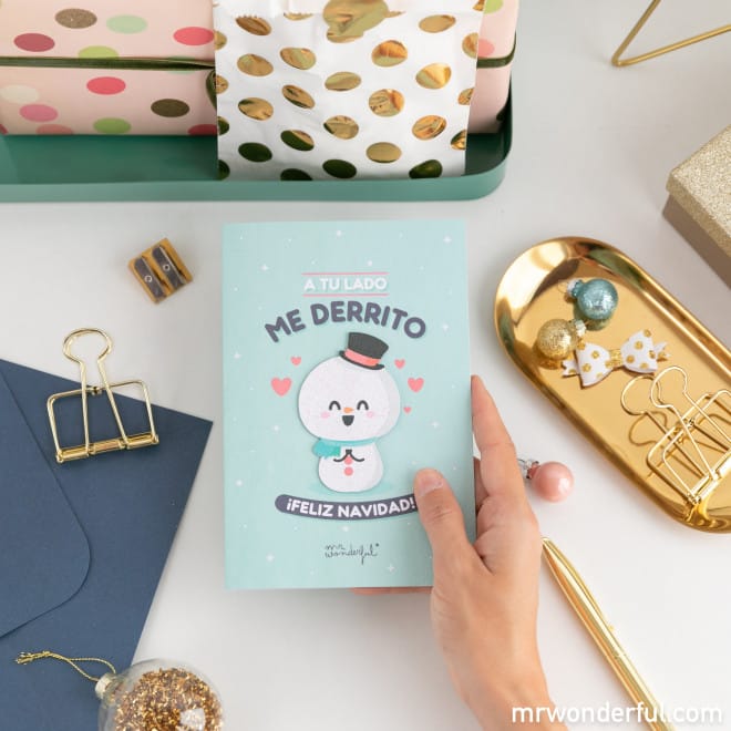 Postal de temática navideña, con acabados especiales y mensaje y diseño Mr. Wonderful. Incluye sobre.