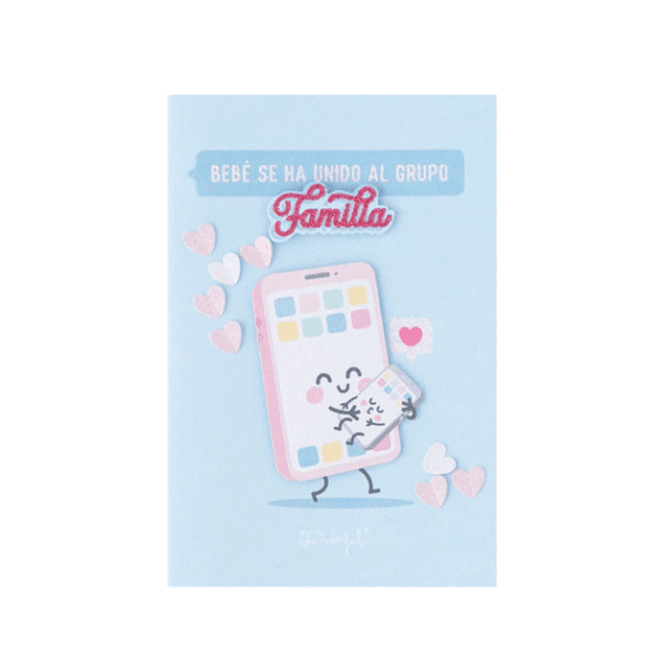 Administrador del grupo, estate atento porque ya está aquí. Ya ha llegado el nuevo miembro de la familia que llevabais esperando todos estos meses. Si es que acaba de llegar y ya tiene acumulados millones de likes, ¡y followers no le faltan! Porque familia que tiene grupo de Whatsapp, familia que permanece unida, y ahora que “Bebé” se ha unido a la fiesta, ¡todavía más! Ahora solo queda pensar qué detalle es el ideal para recibirle como toca, y esta moderna y divertida postal es un acierto más que asegurado. Ya sea para regalarla solita dedicando unas bonitas palabras o para complementar otro regalo, estamos seguros de que les sacará una gran sonrisa… ¡a los tres! Fabricada con materiales y tintas especiales, sus acabados son de calidad y su diseño con detalles en purpurina y con los móviles protagonistas y corazones en relieve, la hacen única y muy diferente a las típicas postales. En su interior, puedes contar con espacio para inspirarte y escribir una bonita dedicatoria, o en el caso de que seáis un grupito, firmar todos felicitándoles en el que es uno de los momentos más increíbles de sus vidas. Además, viene con un sobre en el que podréis meterla para que no se estropee y se enamoren nada más abrirlo al ver esta maravillosa postal.