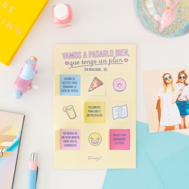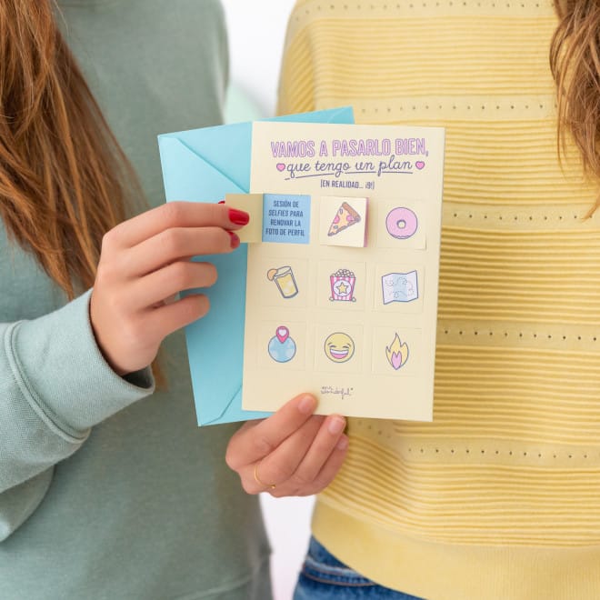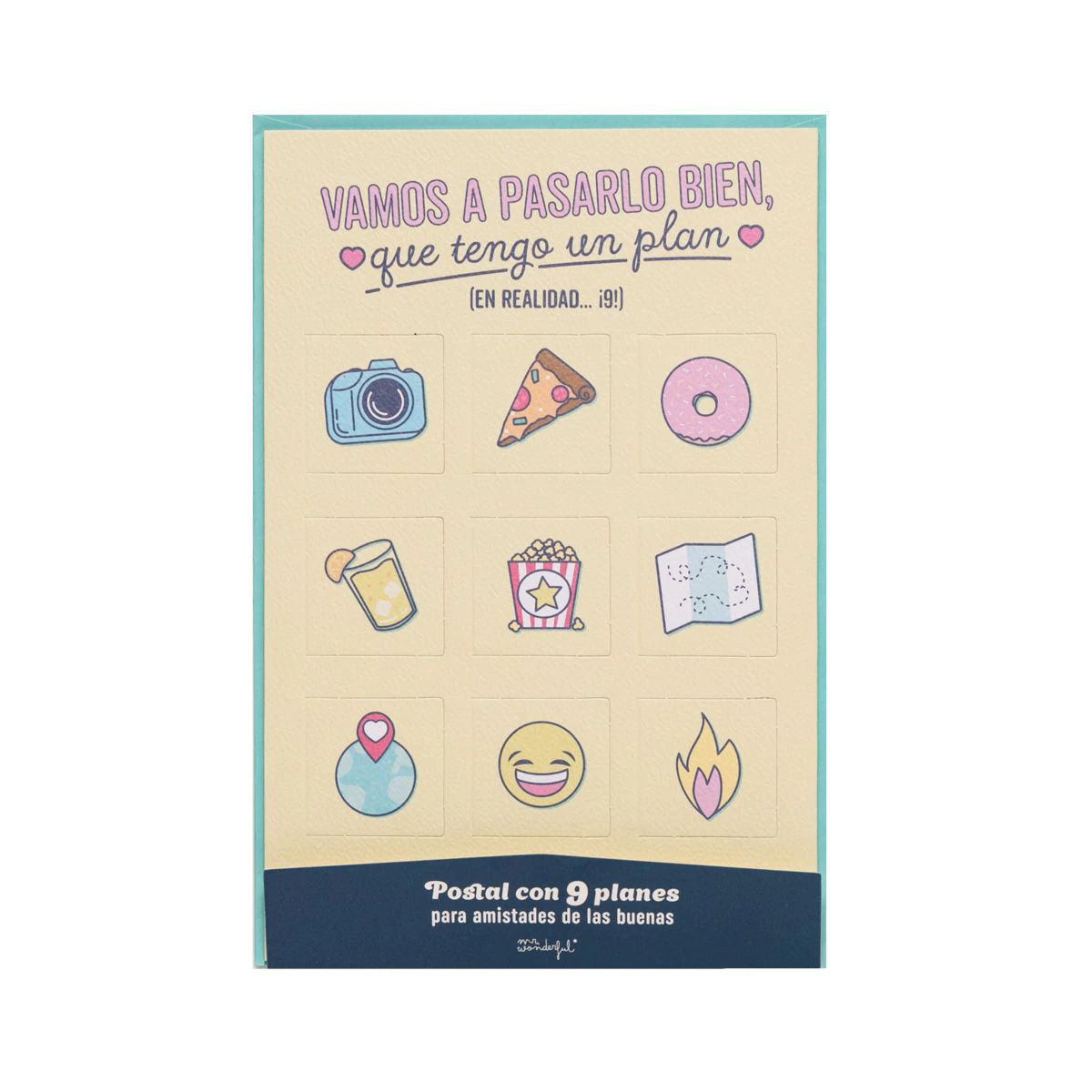 Postal con temática de amistad. Contiene 9 ventanas pretroqueladas en su parte frontal que, al ir abriéndolas, irán descubriendo un total de 9 planes para hacer entre amigos. Incluye sobre.
