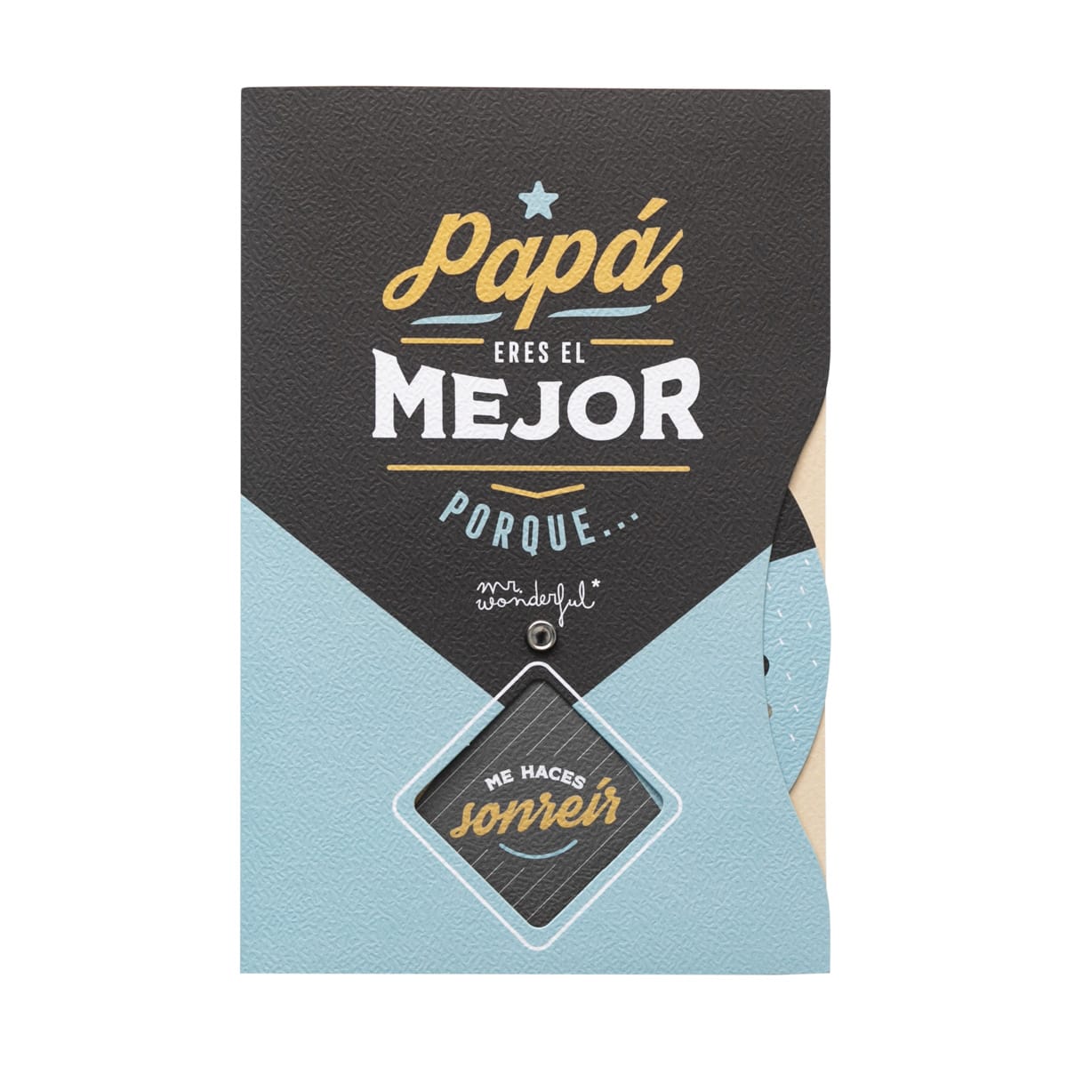 Postal con mensaje para padres, incluye una ruleta que, al girarla, va descubriendo hasta 5 mensajes distintos dedicados a papá. Medidas: 12 x 18 cm. Incluye sobre.