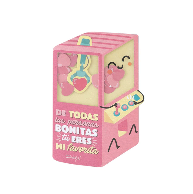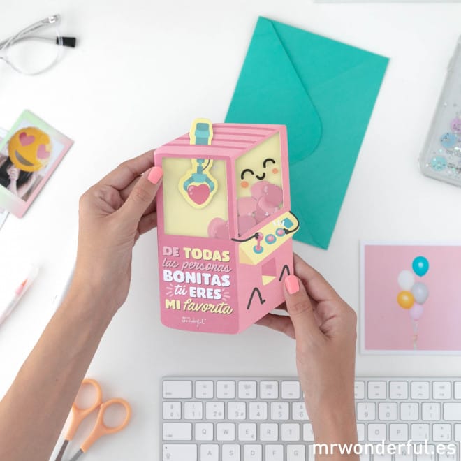 Lo tuyo es suerte y lo demás, tonterías. Porque de todos los premios que había disponibles en la feria, ¡tú te has llevado el mejor de todos! Es decir: conocer a esa persona tan especial que hace que la vida sea aún más fenomenal y que te alegra día sí y día también. Por eso, no debes cansarte nunca de decírselo y repetírselo bien alto y claro… ¡y de todas las maneras posibles! Por ejemplo, con ayuda de esta preciosa postal Mr. Wonderful que es todo colorido, alegría, buen rollo y amor del bueno. Y es que se trata de una postal que cuenta con espacio para escribir y, sobre todo, un diseño exclusivo y de lo más divertido que representa esas máquinas de feria con las que todos, con más o menos suerte, hemos intentado conseguir llevarnos un premio en forma de peluche, muñeco o similar. Una máquina que inspira buen rollo nada más verla y que los más cinéfilos asociarán con la genial Toy Story. Además, la postal incluye un mensaje de esos que nos llegan a la patata y que dice: “De todas las personas bonitas, tú eres favorita”. De modo que resulta ideal para regalar a amigos, familiares, amorcetes o a quien quieras decirle lo mucho que lo quieres.