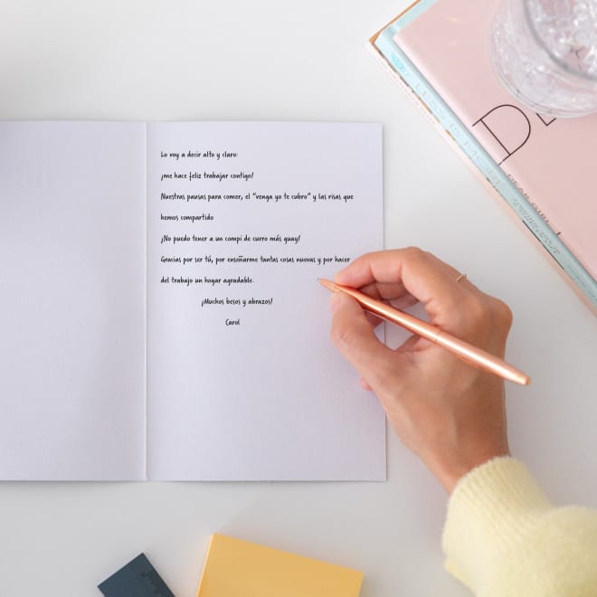 Postal realizada en papel de 100 gr., con acabados especiales y con mensaje dedicado a compañeros/as de trabajo.