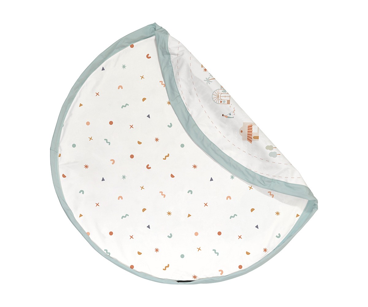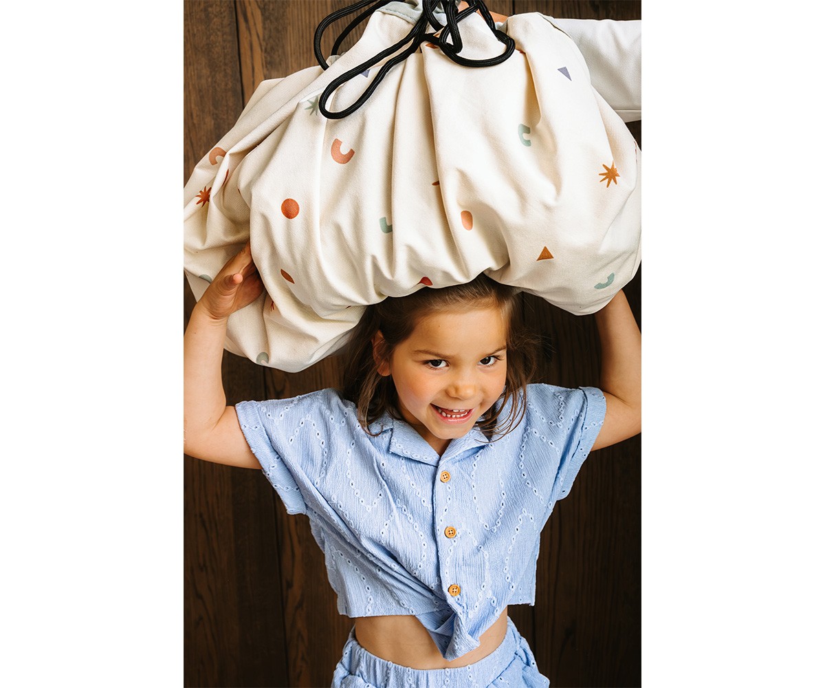 Una práctica manta de juego que se transforma en saco para guardar juguetes de forma rápida y ordenada.