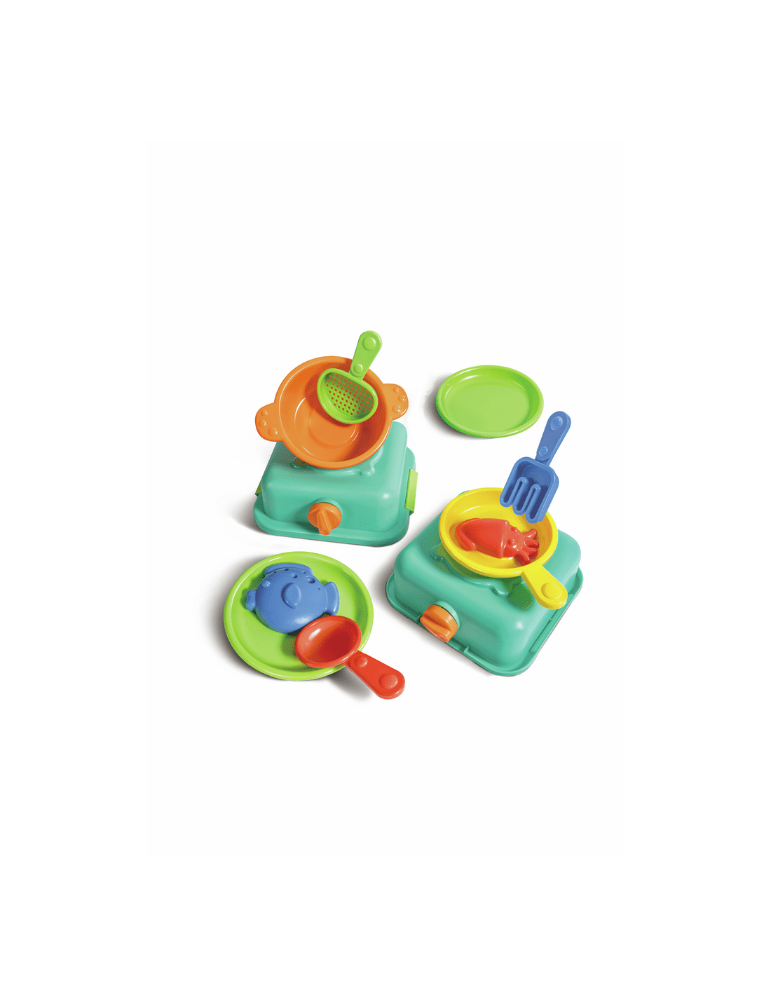 Este set de cocina para arena de Hape incluye 11 piezas, como fogones, olla, sartén y utensilios, ideales para que los niños a partir de 18 meses desarrollen su motricidad fina y creatividad mientras juegan al aire libre.