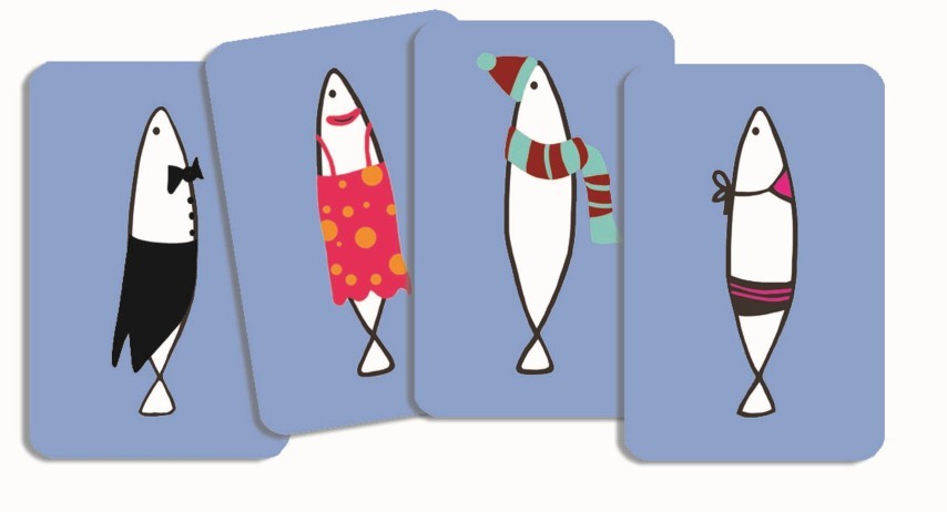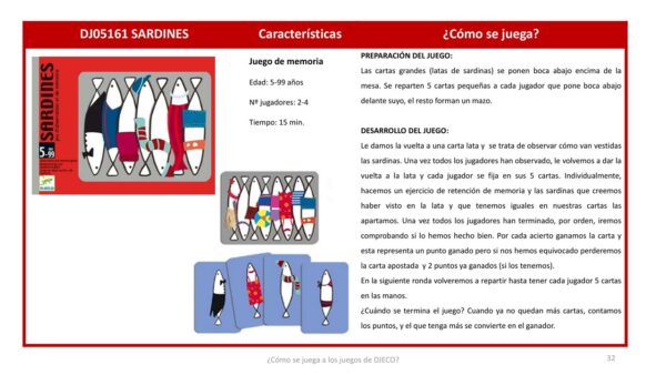 Sardines propone un reto rápido y dinámico: en cada ronda, los jugadores observan durante unos segundos una carta grande con varias sardinas ilustradas dentro de la lata. Después, deberán localizarlas entre sus cartas pequeñas. Cuando el mazo se agota, gana quien haya conseguido pescar más sardinas.