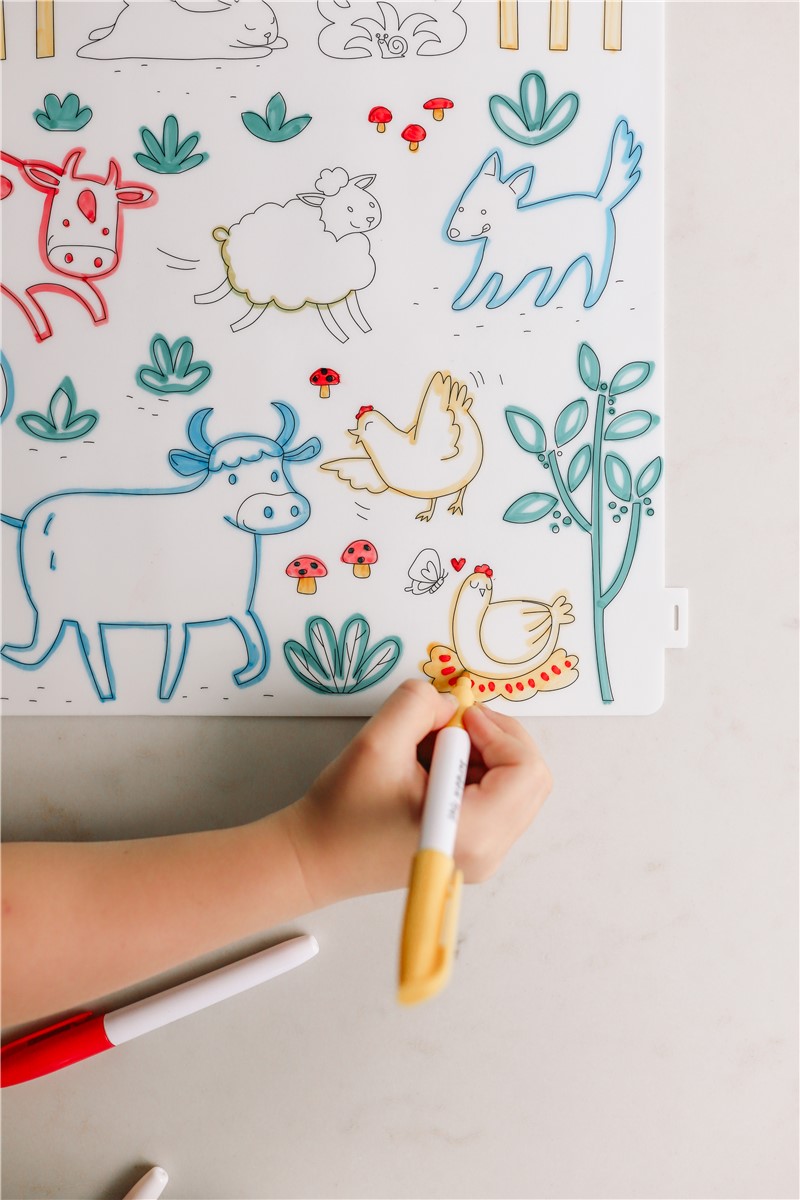 Un set creativo reutilizable que permite a los niños colorear escenas de granja y volver a empezar tantas veces como quieran.