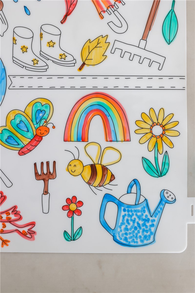 Un set creativo reutilizable que permite a los niños descubrir las estaciones mientras dibujan y colorean.