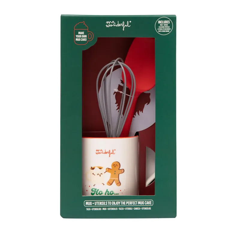 Set de regalo compuesto por una taza de cerámica, un batidor, una espátula de silicona y una plantilla para decorar con azúcar glas. La taza incluye un divertido mensaje navideño.