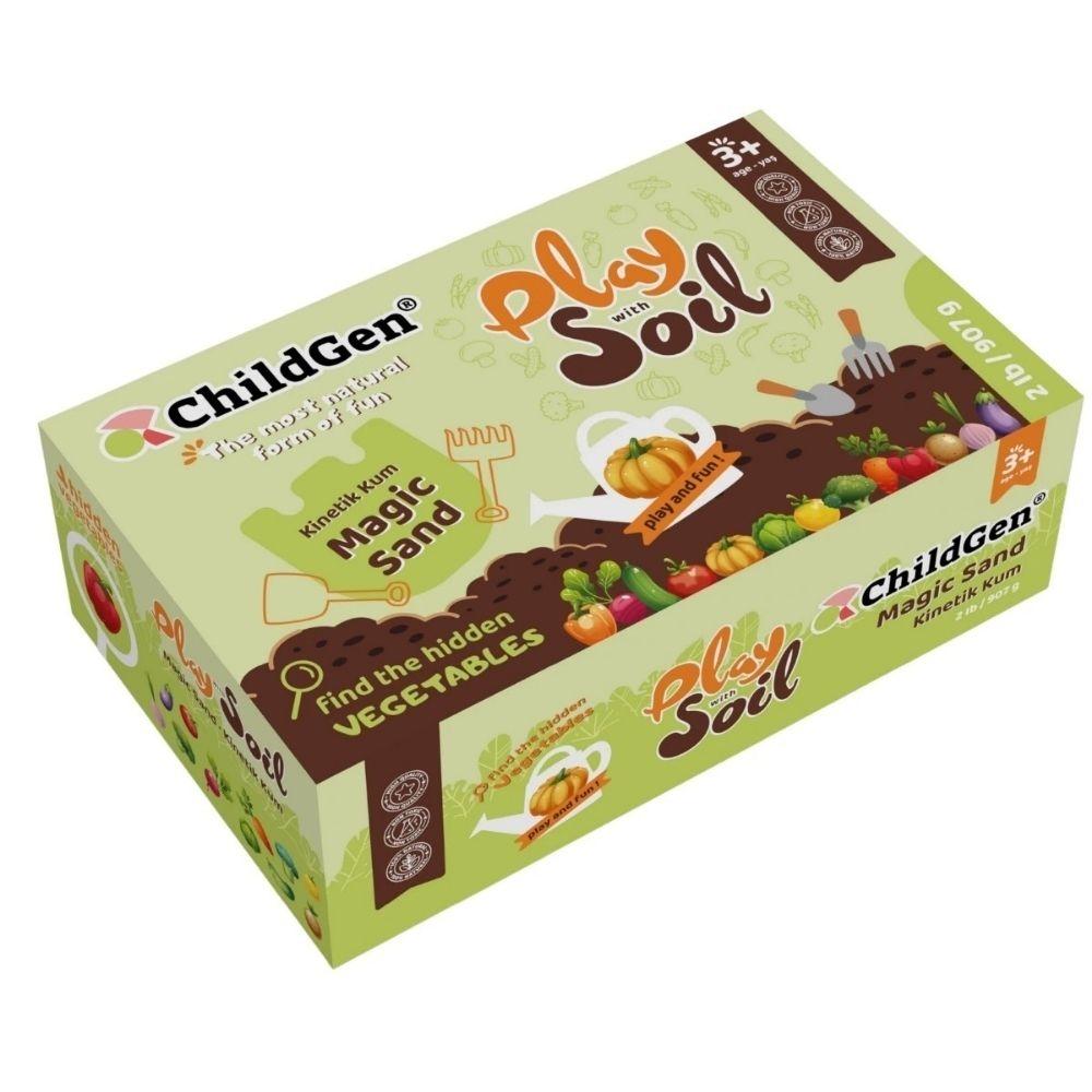El Soil Set de ChildGen combina arena cinética natural color tierra con figuras de frutas y verduras en cartón resistente para recrear un huerto donde sembrar, cosechar y manipular con las manos. Su textura suave y fluida invita a la exploración táctil y al juego tranquilo, favoreciendo la motricidad fina y la imaginación.