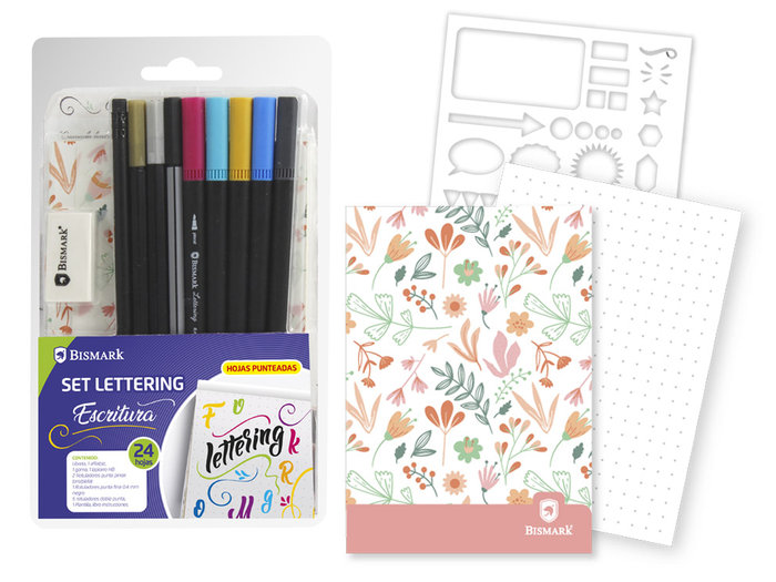 SET LETTERING ESCRITURA. LIBRETA 24/H BEIGE DE 80GR. CONTIENE 1AFILALAPIZ+1GOMA+1LAPICERO HB+2ROTULADOR PUNTA PINCEL+1ROT PUNTA FINA+5 ROT DOBLE PUNTA+1 PLANTILLA