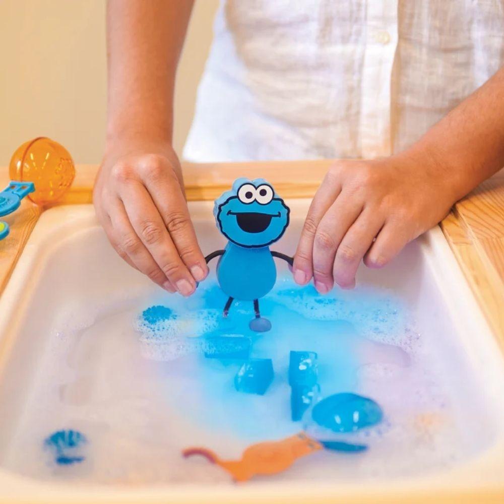 Set personaje Cookie Monster + 2 cubos de luz azul es un juego sensorial acuático que combina personaje y luz para reforzar la relación causa-efecto y convertir el baño o el juego con agua en una experiencia divertida desde los 3 años.