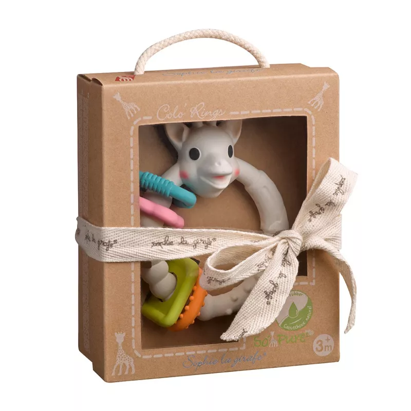 El sonajero mordedor Color Rings Sophie la girafe de Vulli es un juguete sensorial diseñado para estimular al bebé mientras juega y aliviar las molestias que aparecen durante la dentición. Su diseño combina un anillo fácil de agarrar con diferentes formas y texturas que invitan al bebé a explorar y manipular el juguete.