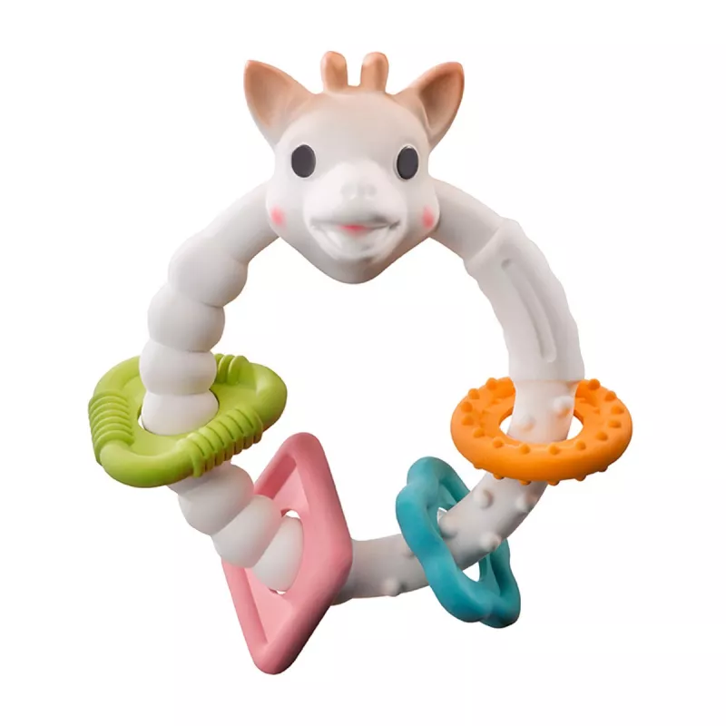 Sonajero mordedor Color Rings Sophie la girafe: anillo sensorial con formas y texturas que entretiene al bebé mientras ayuda a aliviar las encías durante la dentición.