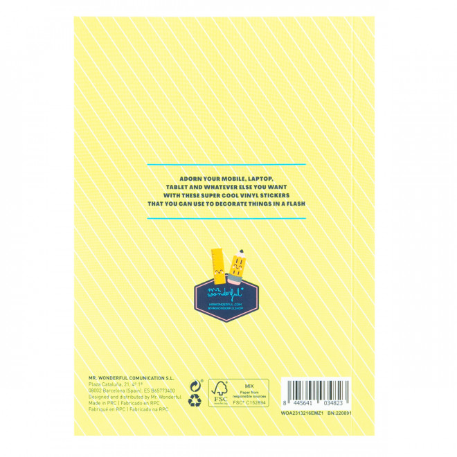 Librito con 20 hojas de pegatinas de vinilo, removibles, ideales para enganchar en dispositivos electrónicos o en cualquier otra superficie. Cuenta con la certificación FSC, que garantiza que ha sido fabricada con papel obtenido de bosques gestionados de forma responsable. Decora tu vida con este librito de pegatinas, ¡perfectas para todos tus dispositivos!