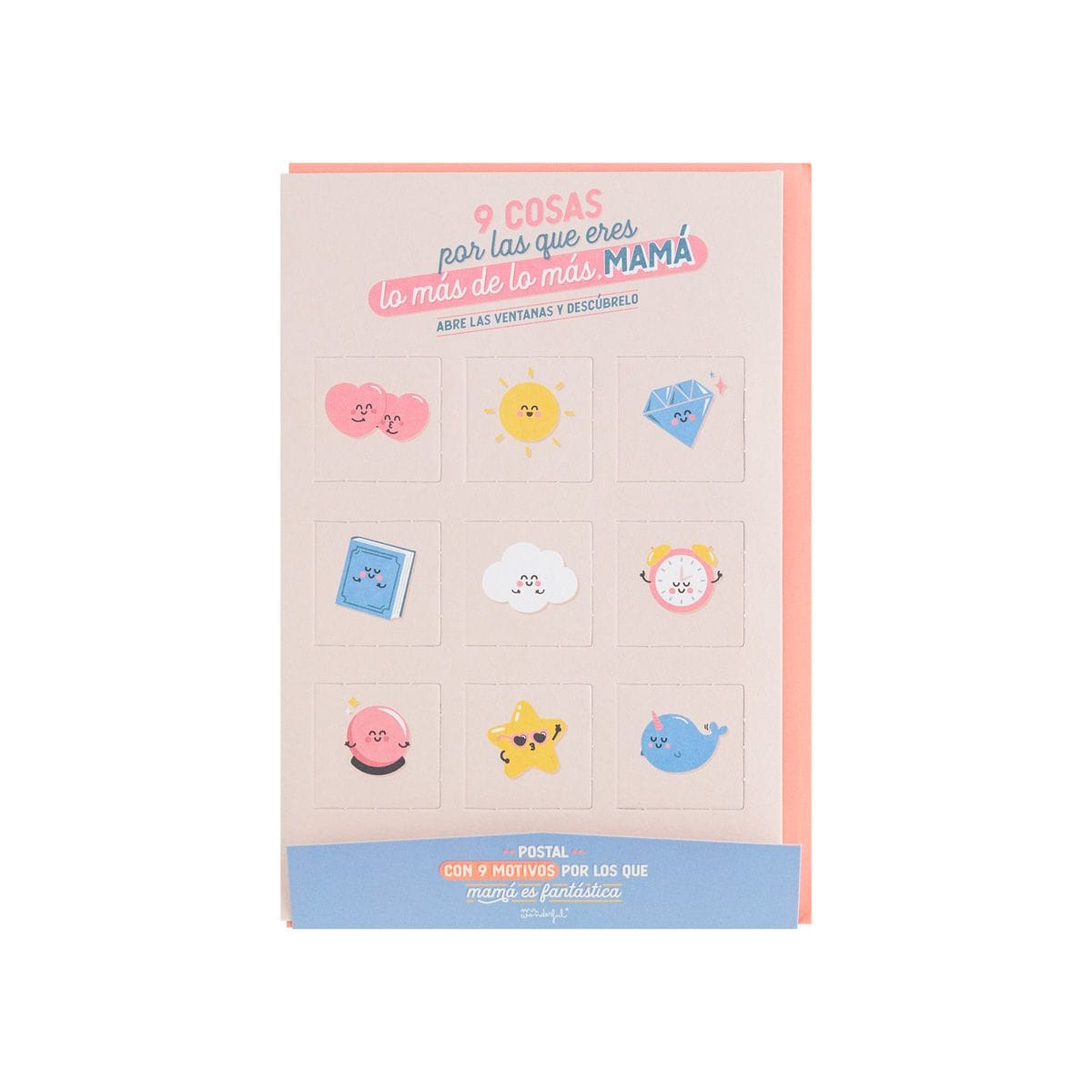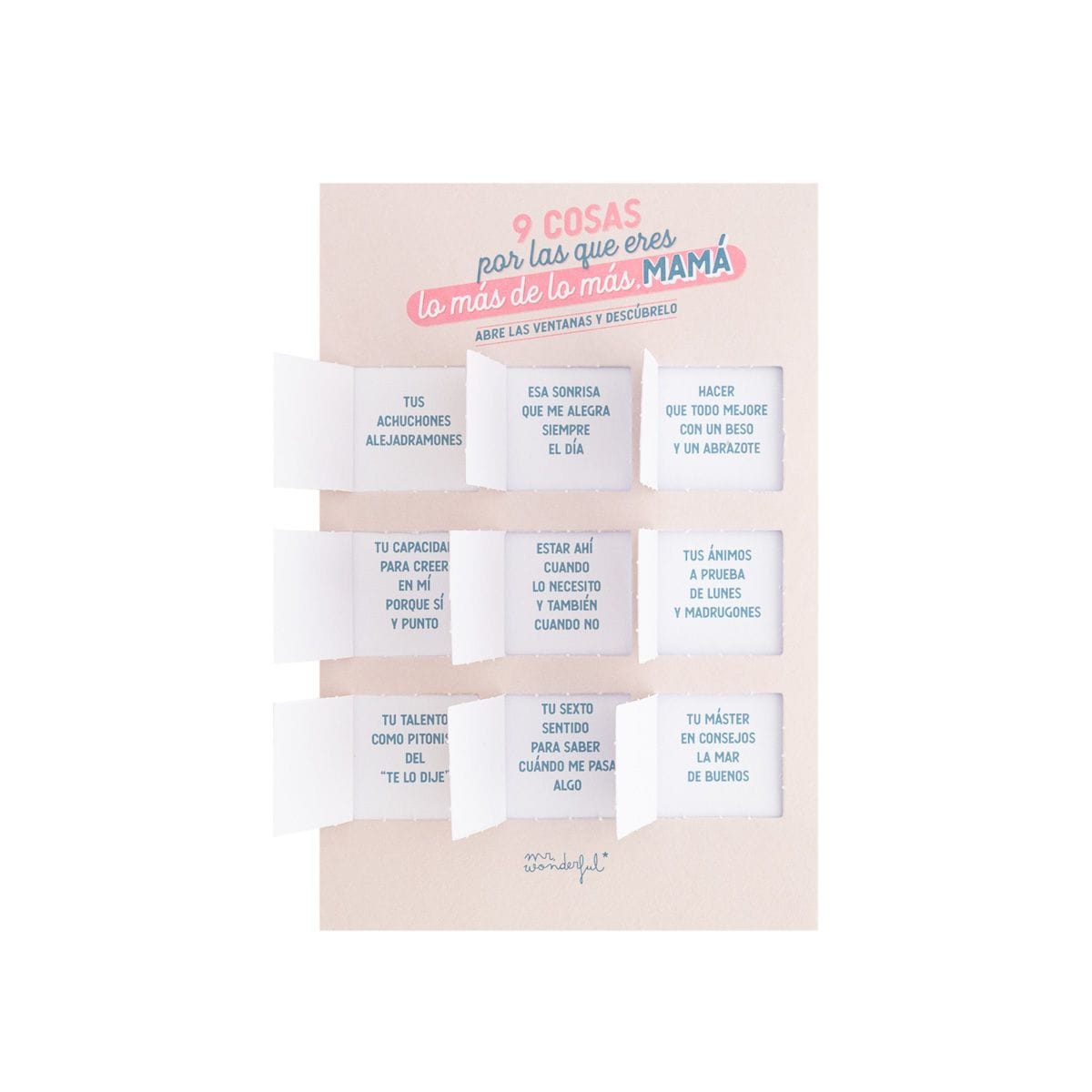 Original postal que cuenta en su portada con nueve ventanas para abrir y descubrir mensajes diferentes dedicados a mamá.