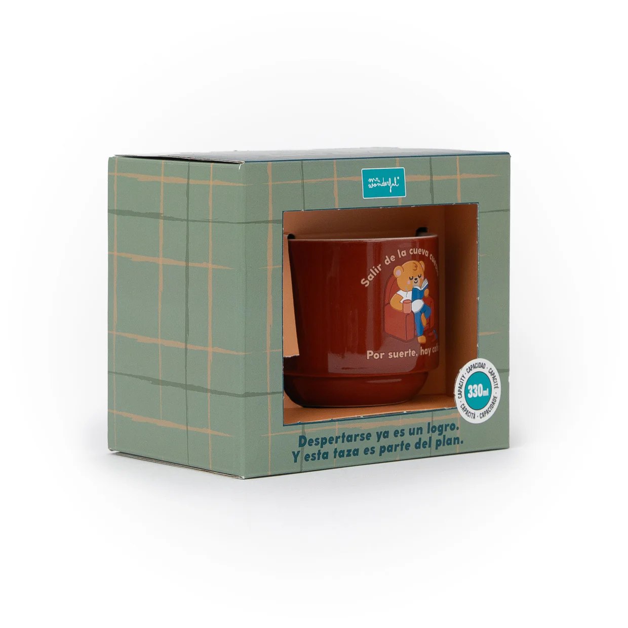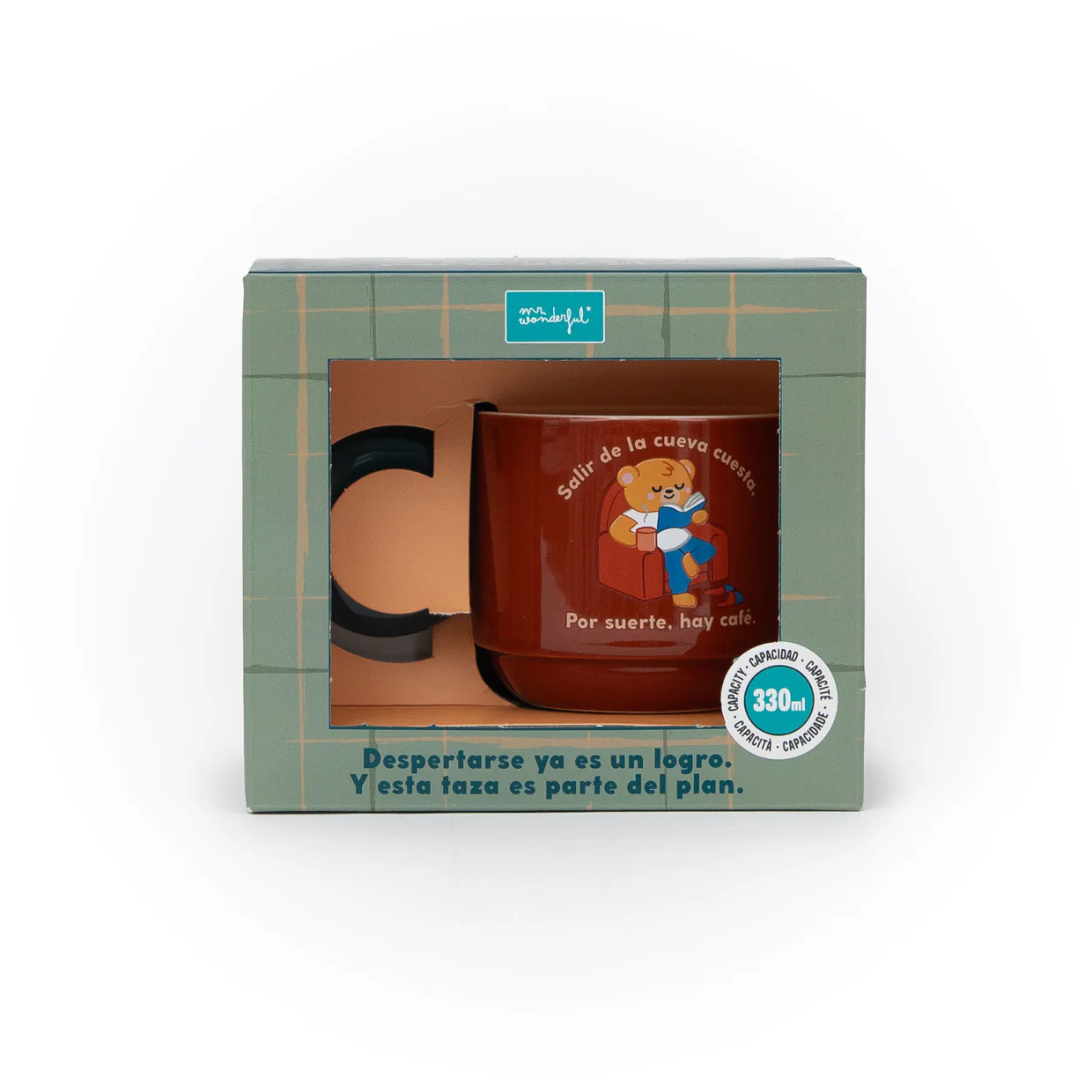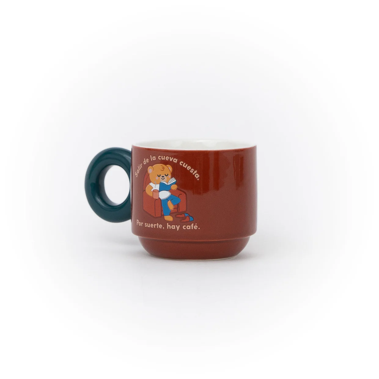 Taza Apilable Salir de la Cueva Cuesta incluye una ilustración de un papá oso descansando en el sofá mientras lee, junto al mensaje “Salir de la cueva cuesta. Por suerte, hay café”. Un diseño que conecta con esos instantes tranquilos y merecidos del día.