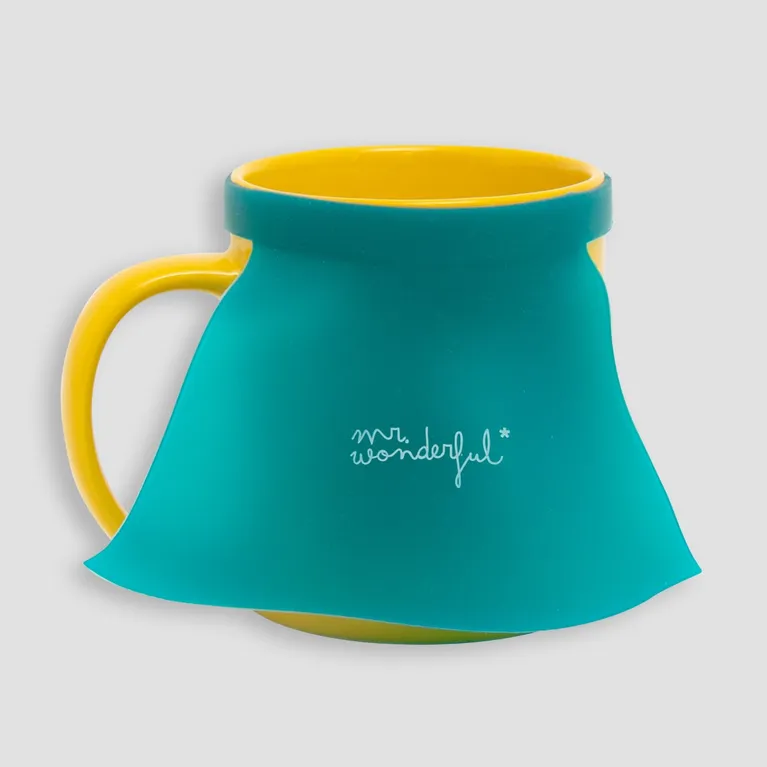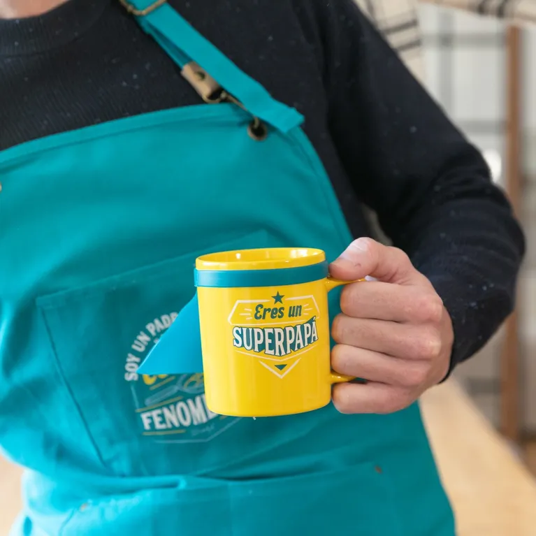 Llamativa taza de cerámica, con mensaje y una original capa de superhéroe extraíble hecha en silicona.