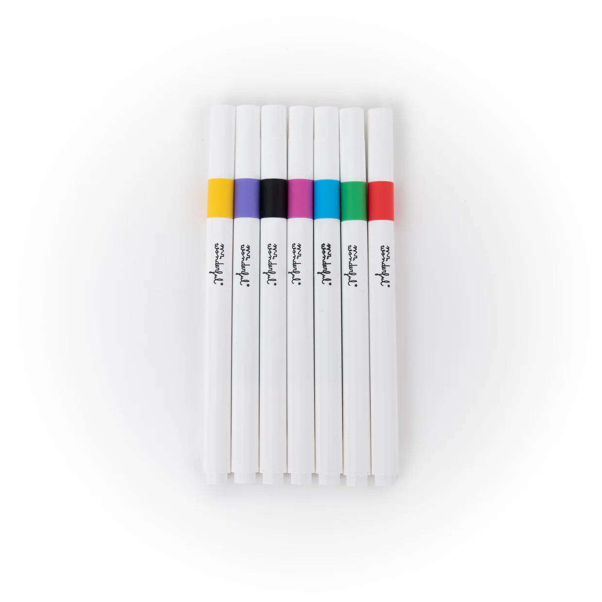 7 rotuladores de colores: naranja, amarillo, rojo, lila, azul, negro y verde.