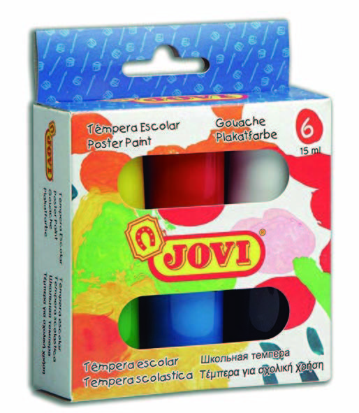 A partir de los 5 años, ¡la Témpera escolar Jovi! Una fantástica gama de divertidos colores que se pueden mezclar y que convertirán en una obra de arte cualquier superficie de papel, cartulina, madera, tela, pasta de modelar o fango. ¿Utensilios? Basta un pincel, un rodillo o una espátula para conseguir los resultados más espectaculares.
