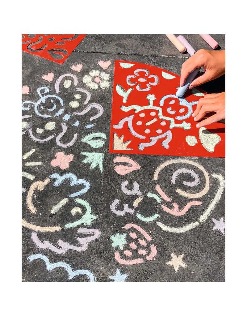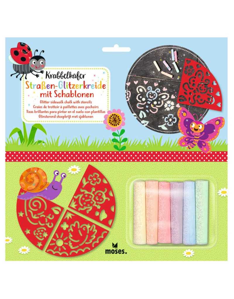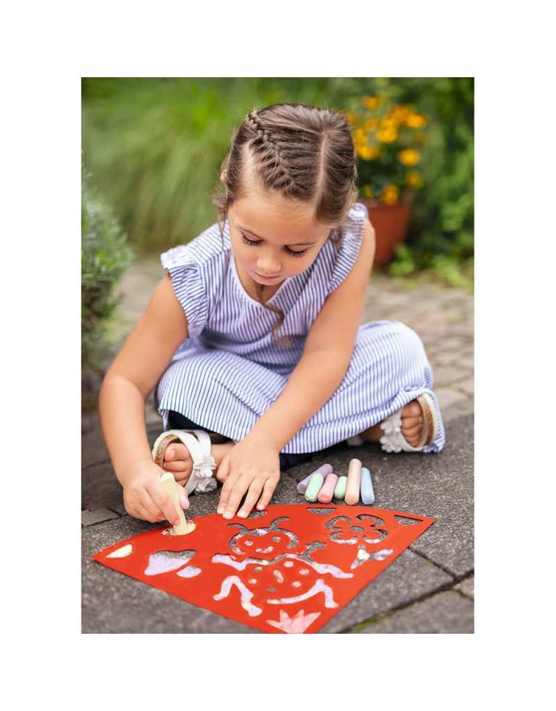 Tiza de suelo con plantillas bichos. Set de 4 plantillas y 6 tizas brillantes en diferentes colores. Las plantillas pueden usarse individualmente o combinarse para formar un gran círculo de 58 cm de diámetro.