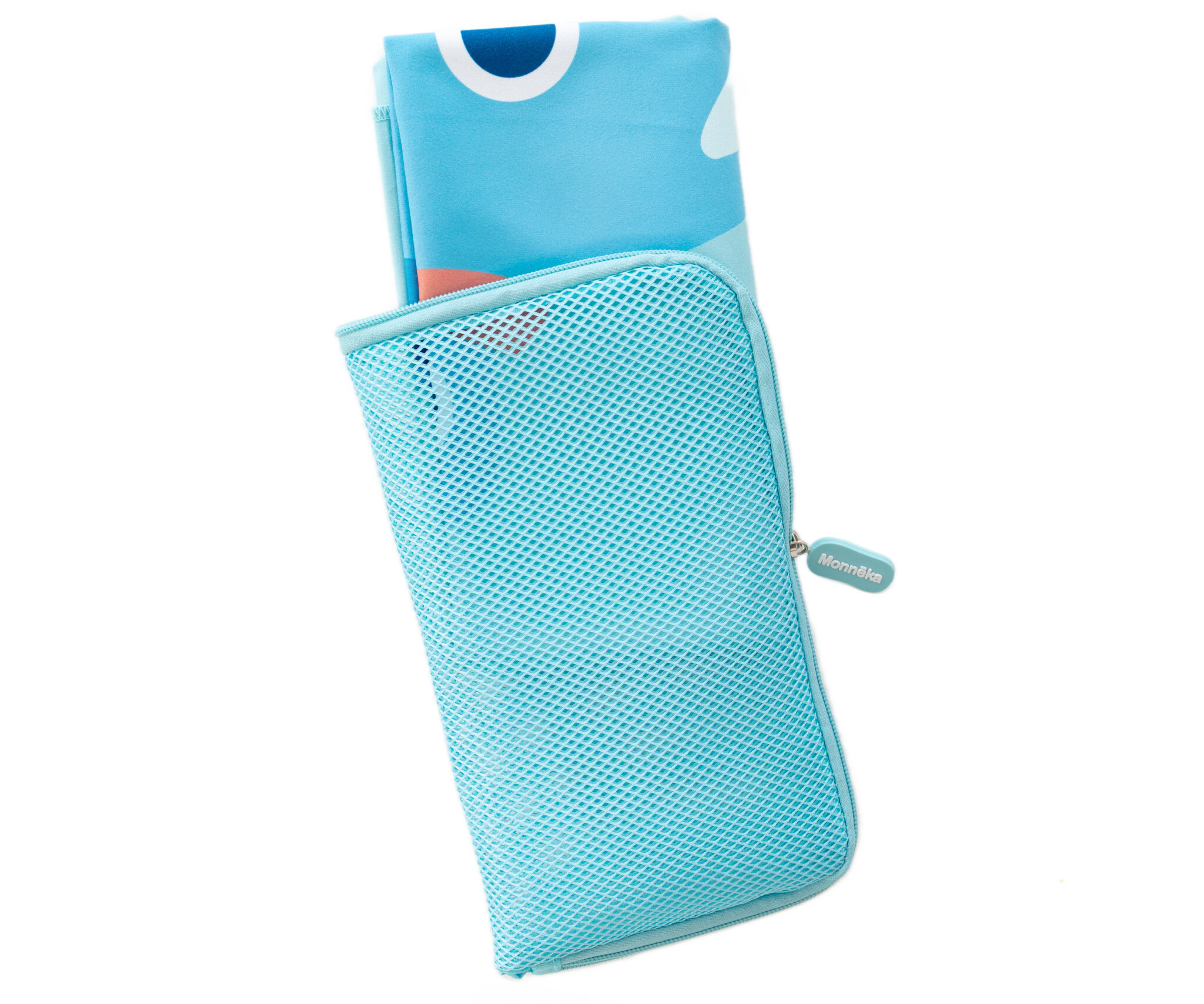 Toalla de microfibra de la marca Monnëka ligera, compacta y de secado rápido con bolsa de malla transpirable.