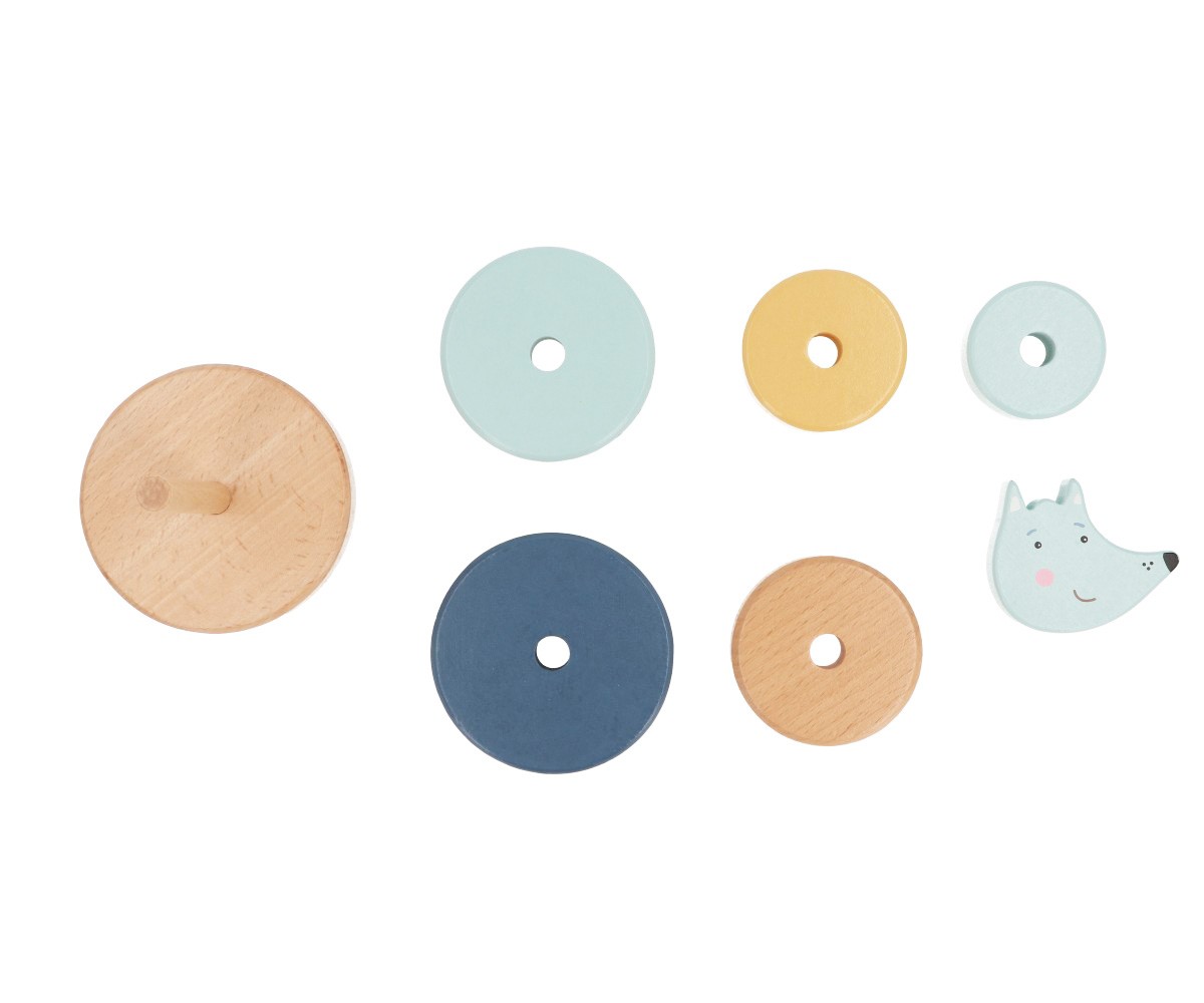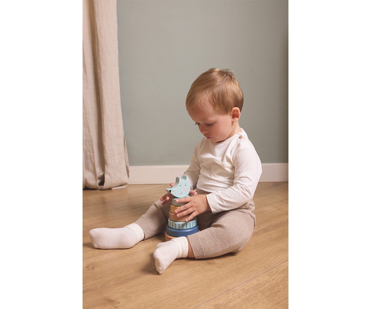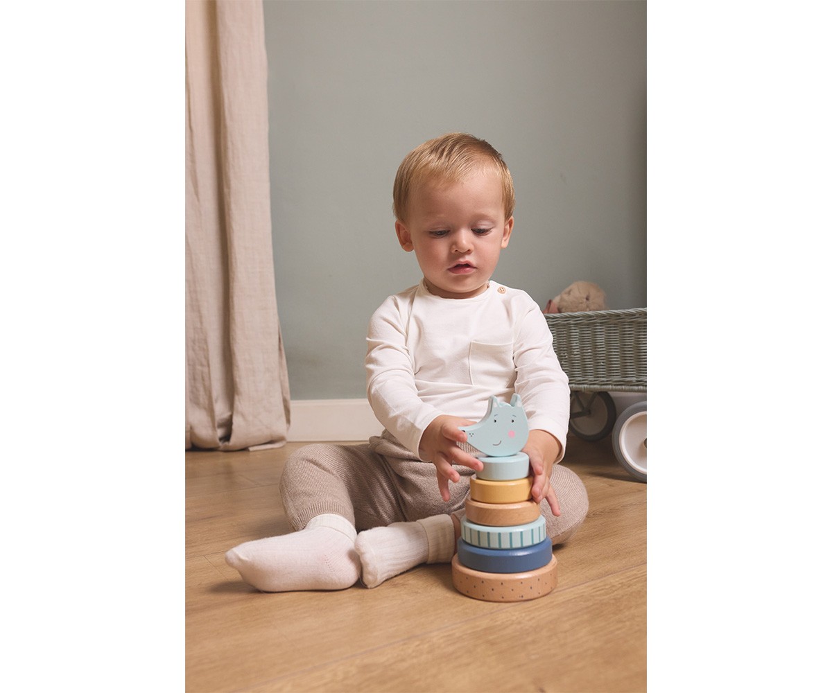 Fabricado en madera de haya 100 % certificada FSC y pintado con pinturas seguras a base de agua, incluye una base y 6 piezas apilables que ayudan al niño a desarrollar la motricidad fina, la coordinación ojo-mano y el sentido del equilibrio. Su acabado redondeado y su tamaño son perfectos para las pequeñas manos.