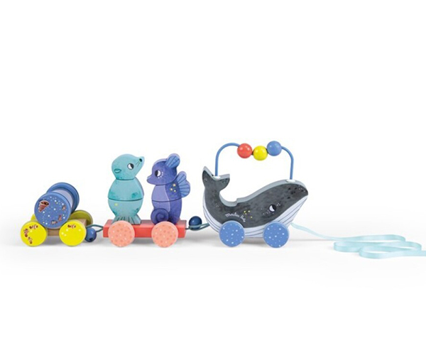 Tren de arrastre con diversas actividades de la colección Las Aventuras de Paulie. Un rodari con bolitas, un encajable de figuras marinas y un laberinto de bolas.