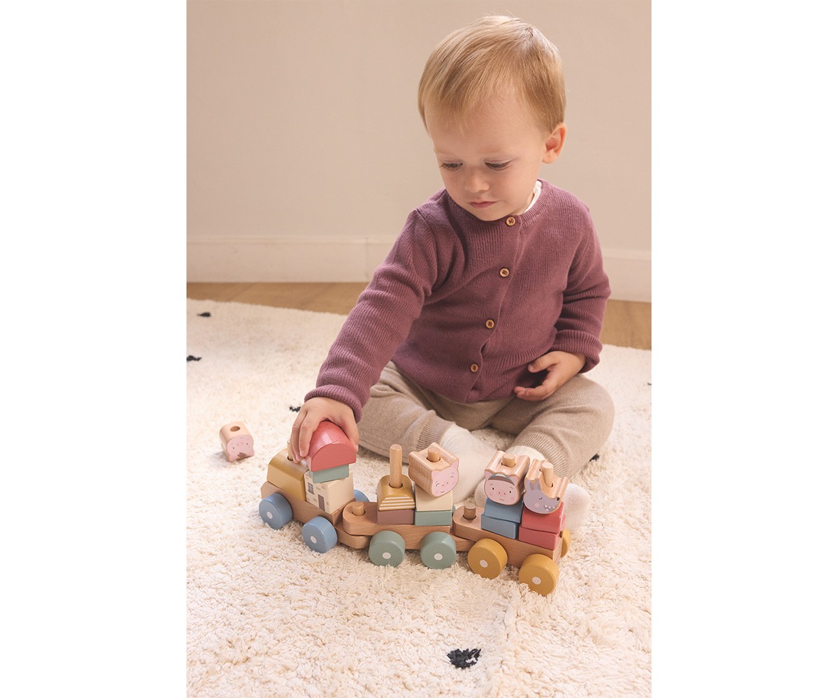 Fabricado en madera de alta calidad, este tren cuenta con 19 piezas encajables que pueden apilarse y colocarse sobre los vagones. Sus colores suaves y formas redondeadas lo convierten en un juguete seguro y agradable al tacto, ideal para niños a partir de 12 meses.