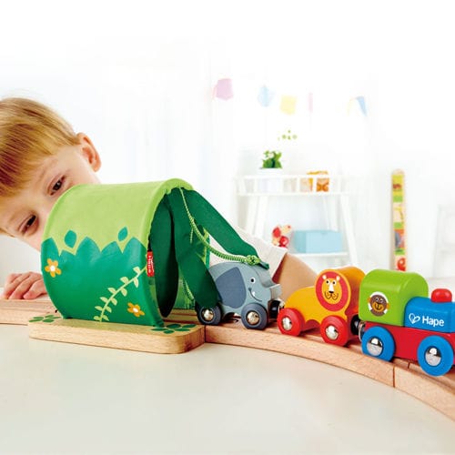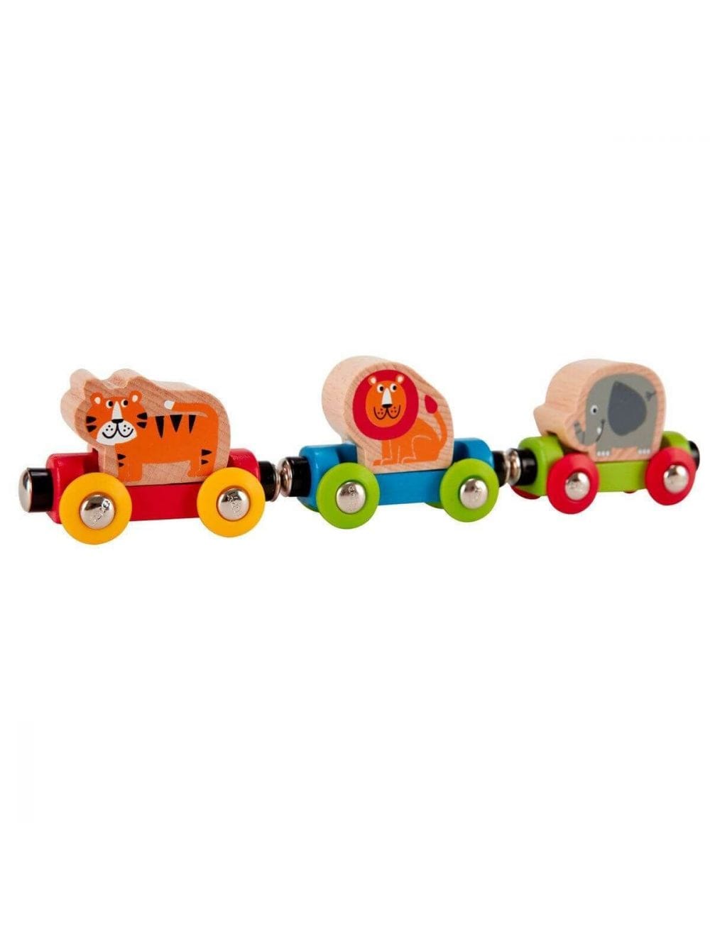 El león, el tigre y el elefante están nerviosos por empezar a vivir una gran aventura. ¡Qué emoción! ¿Está todo listo? Sólo hay que colocar los animales encima de los vagones, juntarlos con el imán y empezar a rodar por toda la casa.